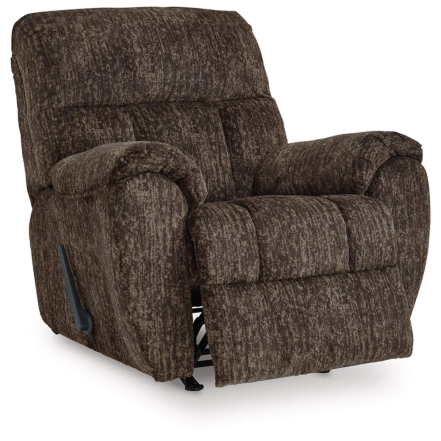 - QUALITY MADE: Pull tab reclining motion. Corner-blocked frame with metal reinforced seat. High-quality foam cushions wrapped in poly fiber. Polyester upholstery in chocolate hue. Gentle rocking motion