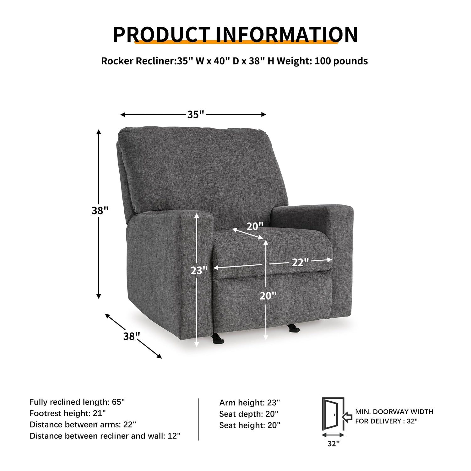 - COMFY SEATING: Measures 35" W x 40" D x 38" H. Arm height 23”. Distance between arms: 22”. Seat depth: 20”. Fully reclined length: 65”. Distance between recliner and wall should be at least 12”