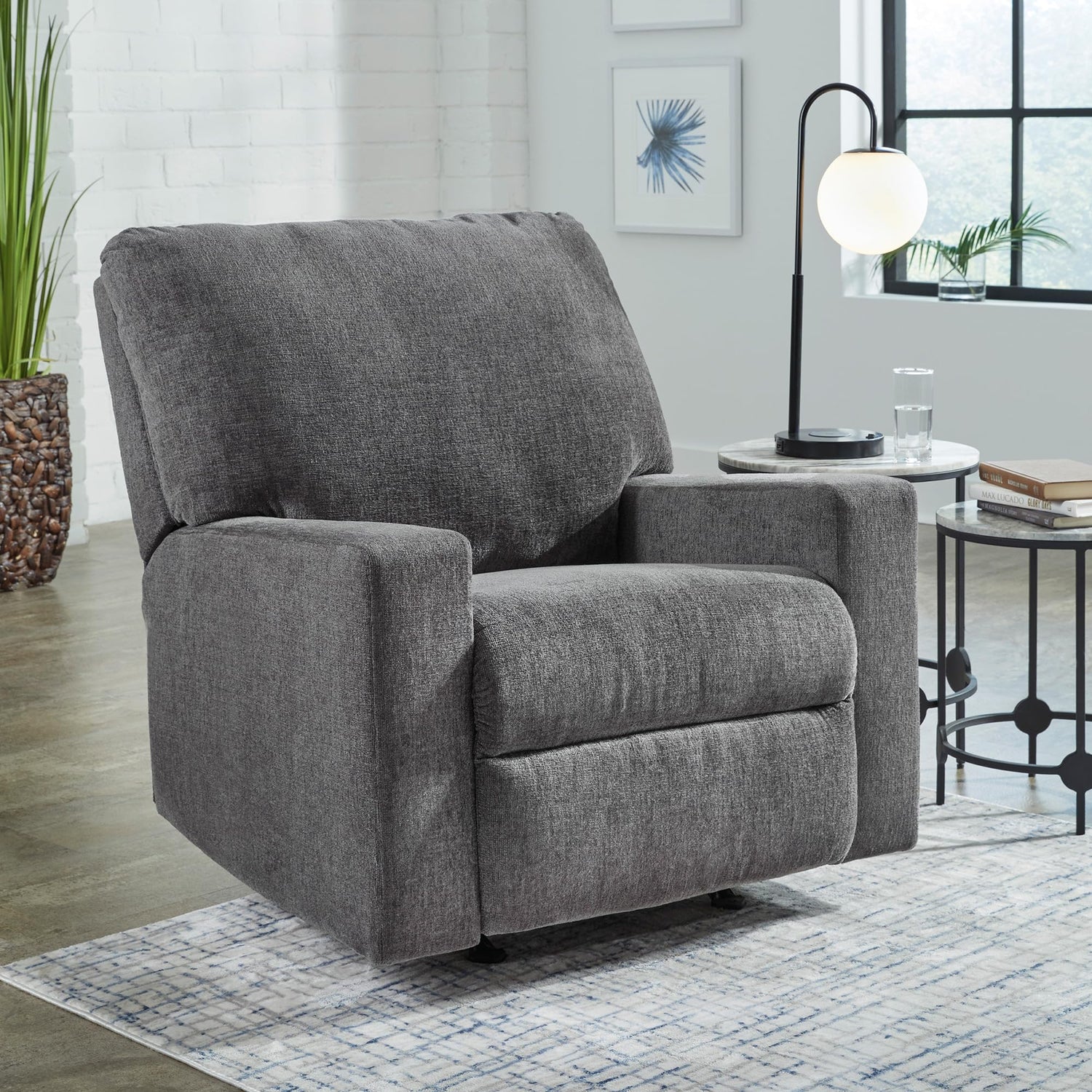 Details: Add functionality to your home without compromising on style. This budget-friendly recliner has a clean-lined, contemporary feel that’s handily complemented with seamless features for your relaxation. Well-suited to living rooms and multi-use spaces alike, it effortlessly prioritizes your comfort and convenience with simple pull tab reclining and a soothing, gentle rocking motion.