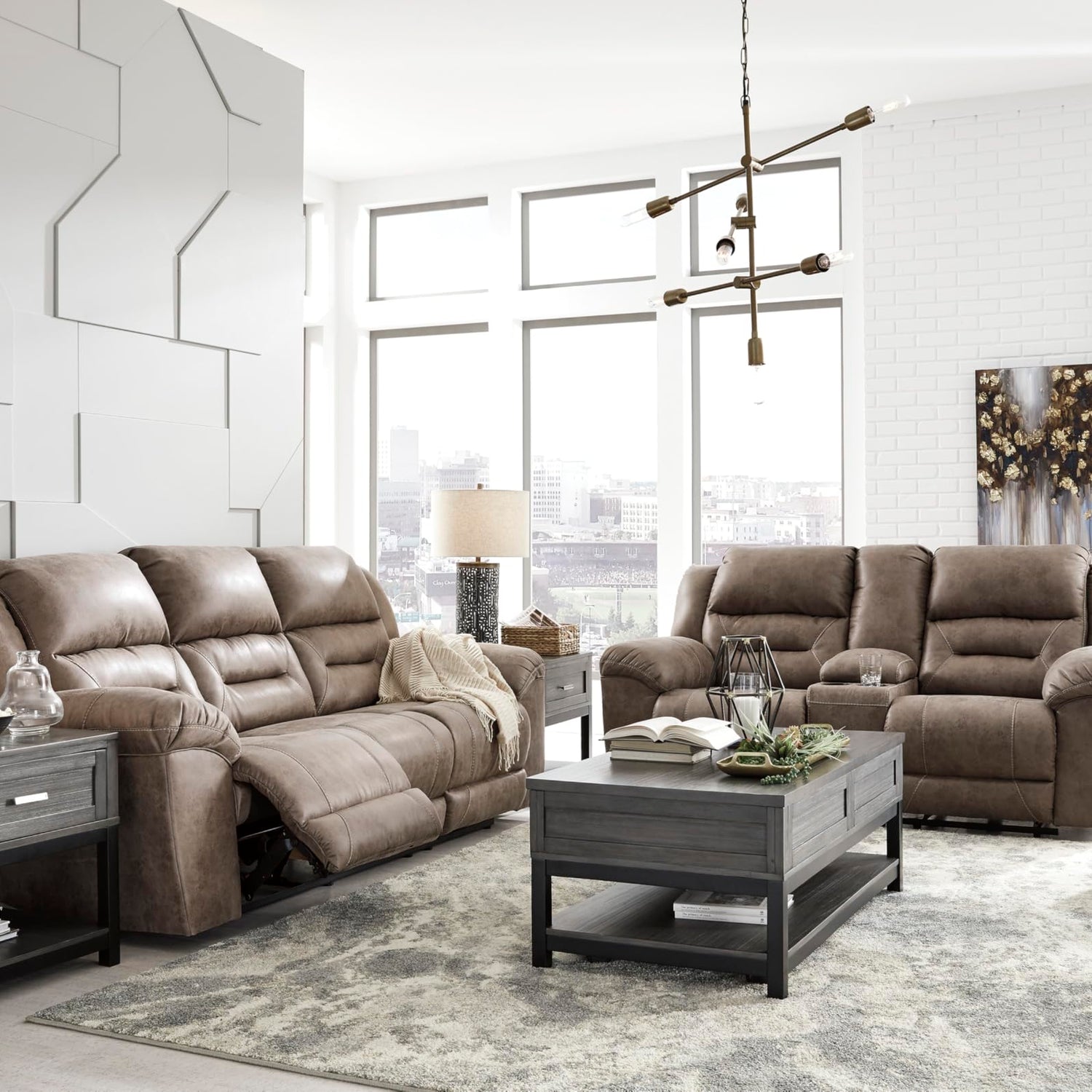 Signature Design by Ashley Stoneland Faux Leather Power Double Reclining Loveseat with Center Console, Light Brown
