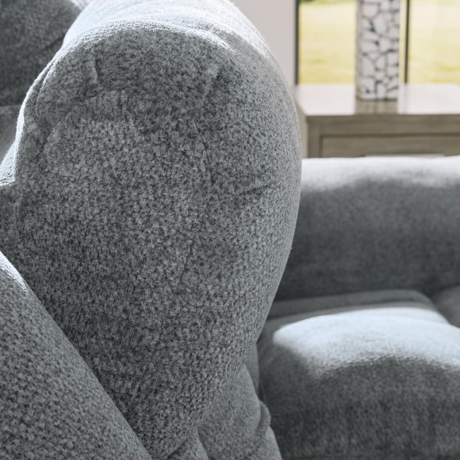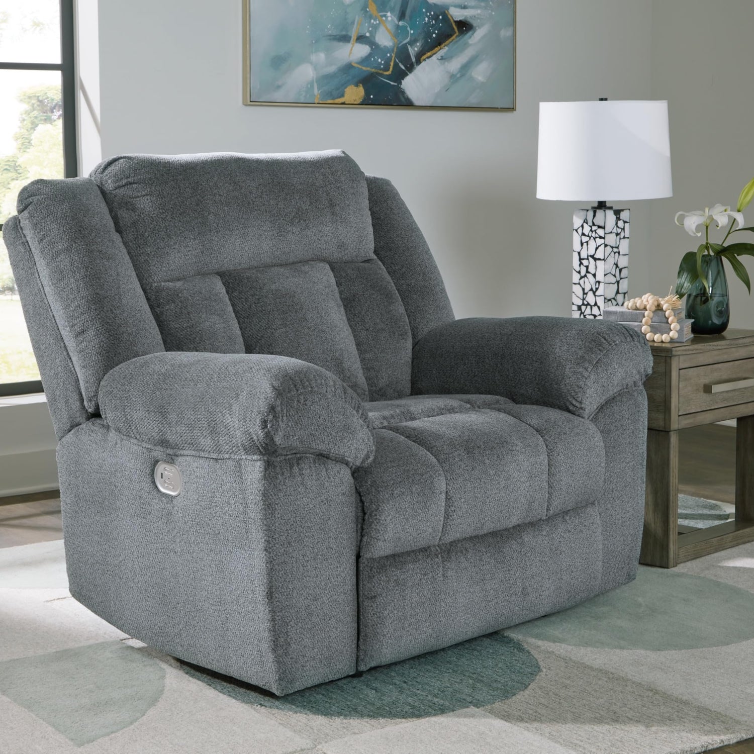 - POWER RECLINER: This recliner's extra-deep seat encourages you to sit back and bliss out. Adjust the recliner and headrest with one-touch controls. Complete with plush upholstery in a trendy hue