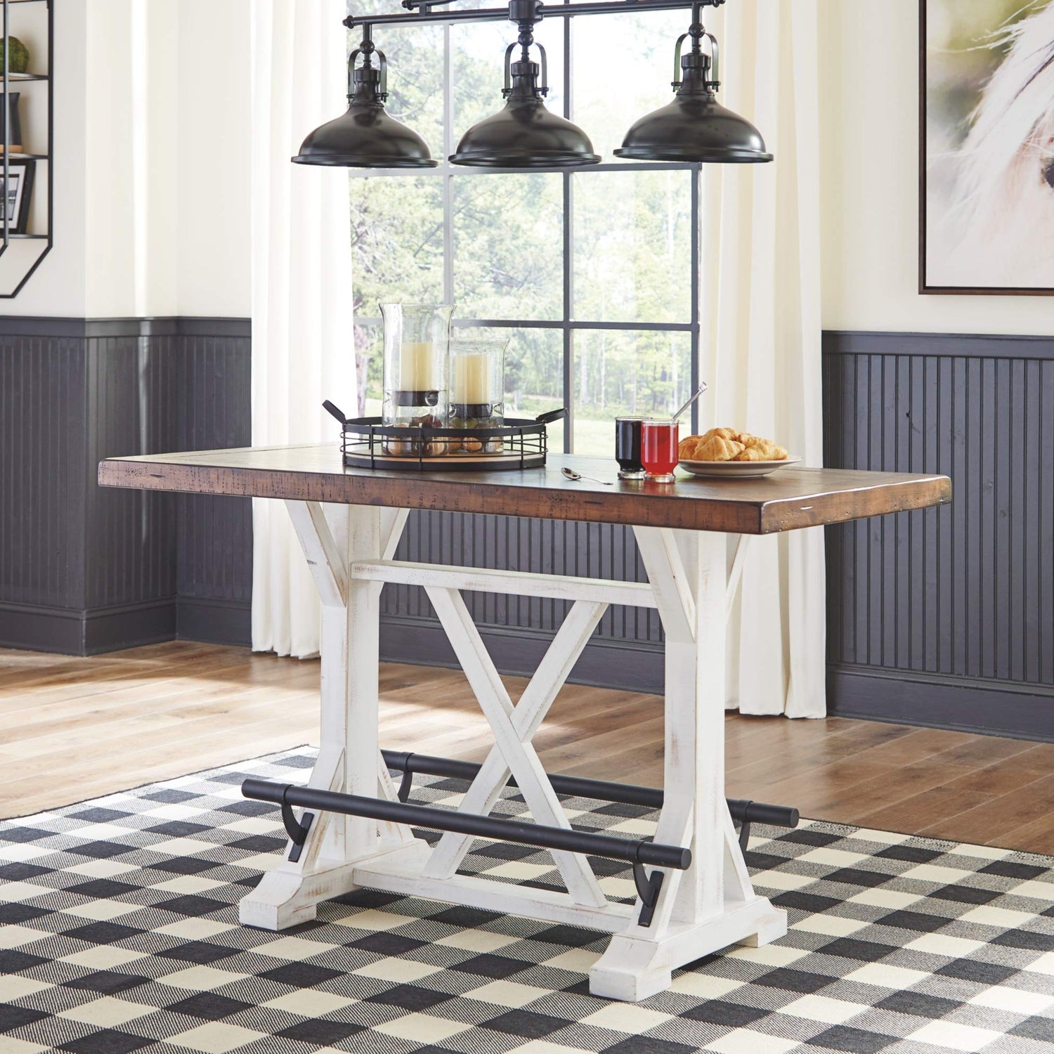 Details: A high-style choice for smaller spaces, this counter height dining table serves up the best in rustic farmhouse living. Two-tone finish pairs a brown tabletop with a distressed vintage white base for a double helping of charm. Black metal foot rests add such a distinctive twist. A beautiful dining table will transform every meal into a five-star experience. Dining tables bring families together—inspiring new recipes, feelings and flavors. You can choose from a variety of gorgeous materials to match your style, such as glass, wood or marble. With unmatched prices and quality, we’re your one-stop destination for furniture, home accents and decor.