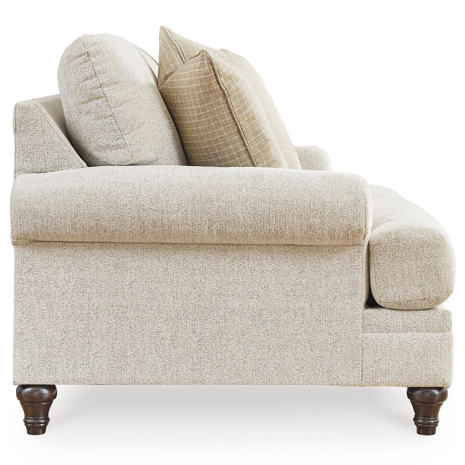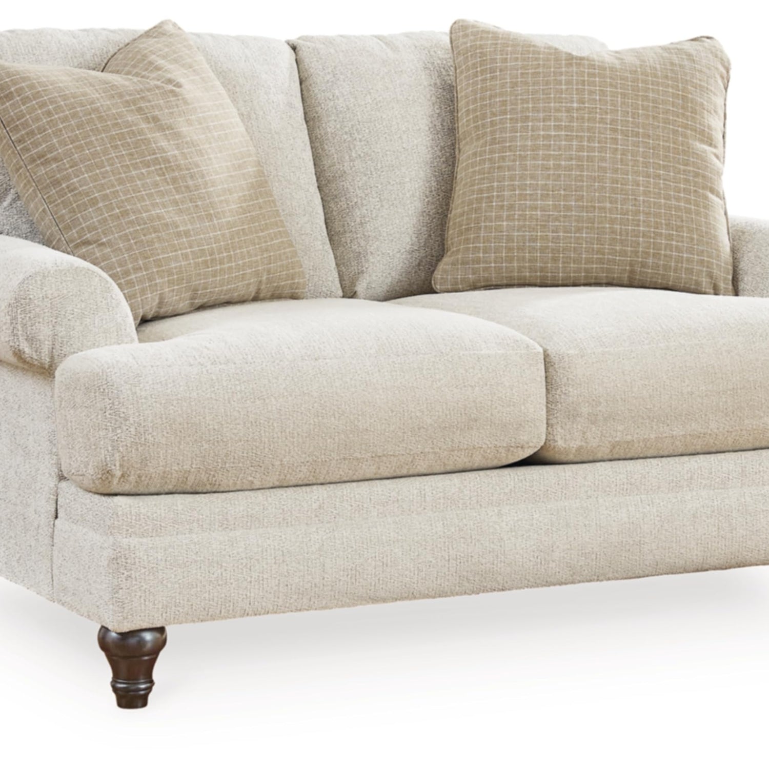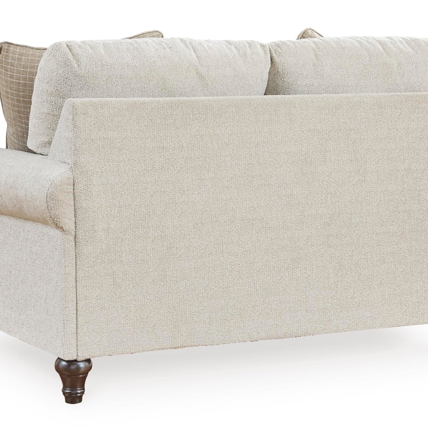• HANDSOMELY MADE: Built with a sturdy corner-blocked frame. Polyester upholstery. Reversible seat and back cushions. Decorative turn leg. Accent pillows included