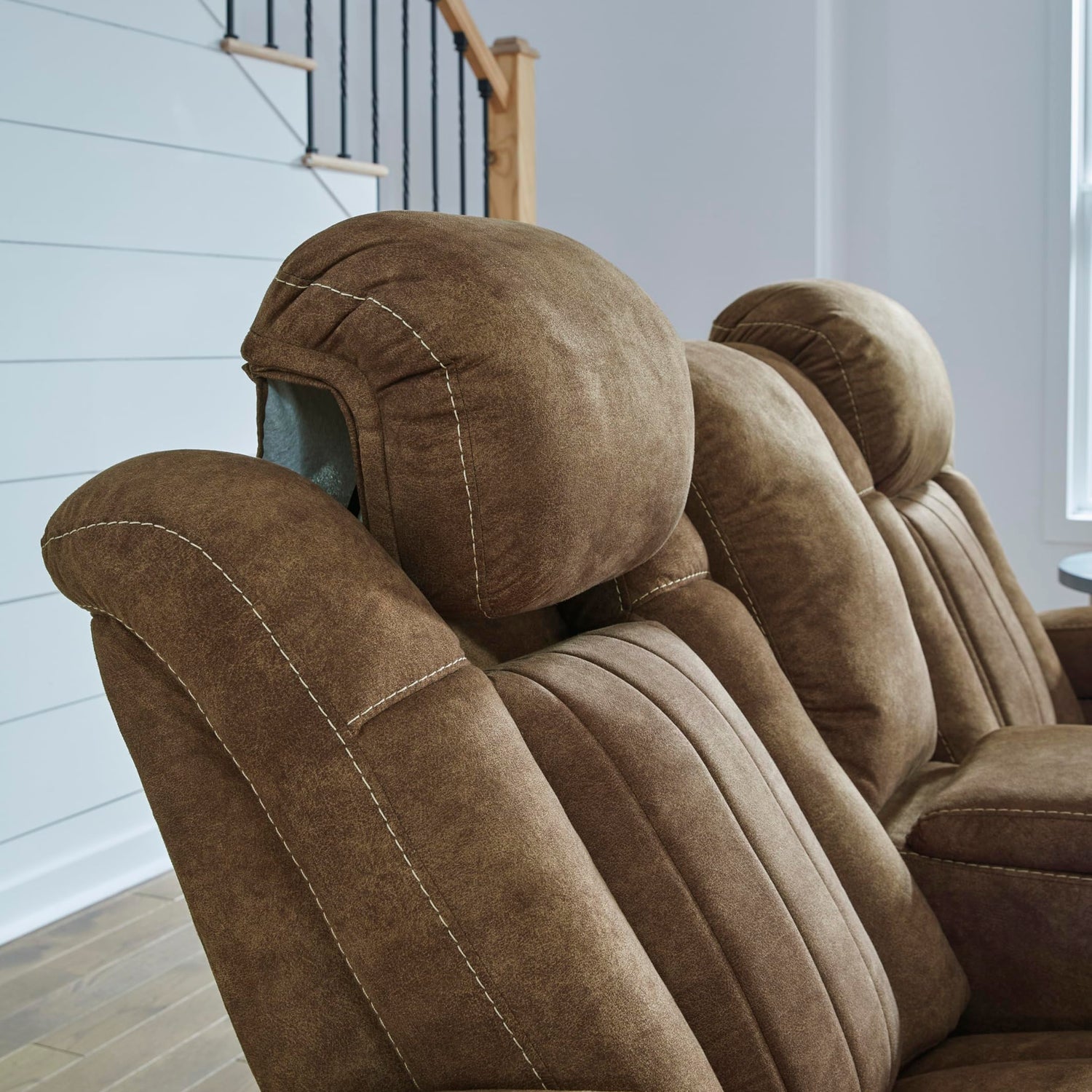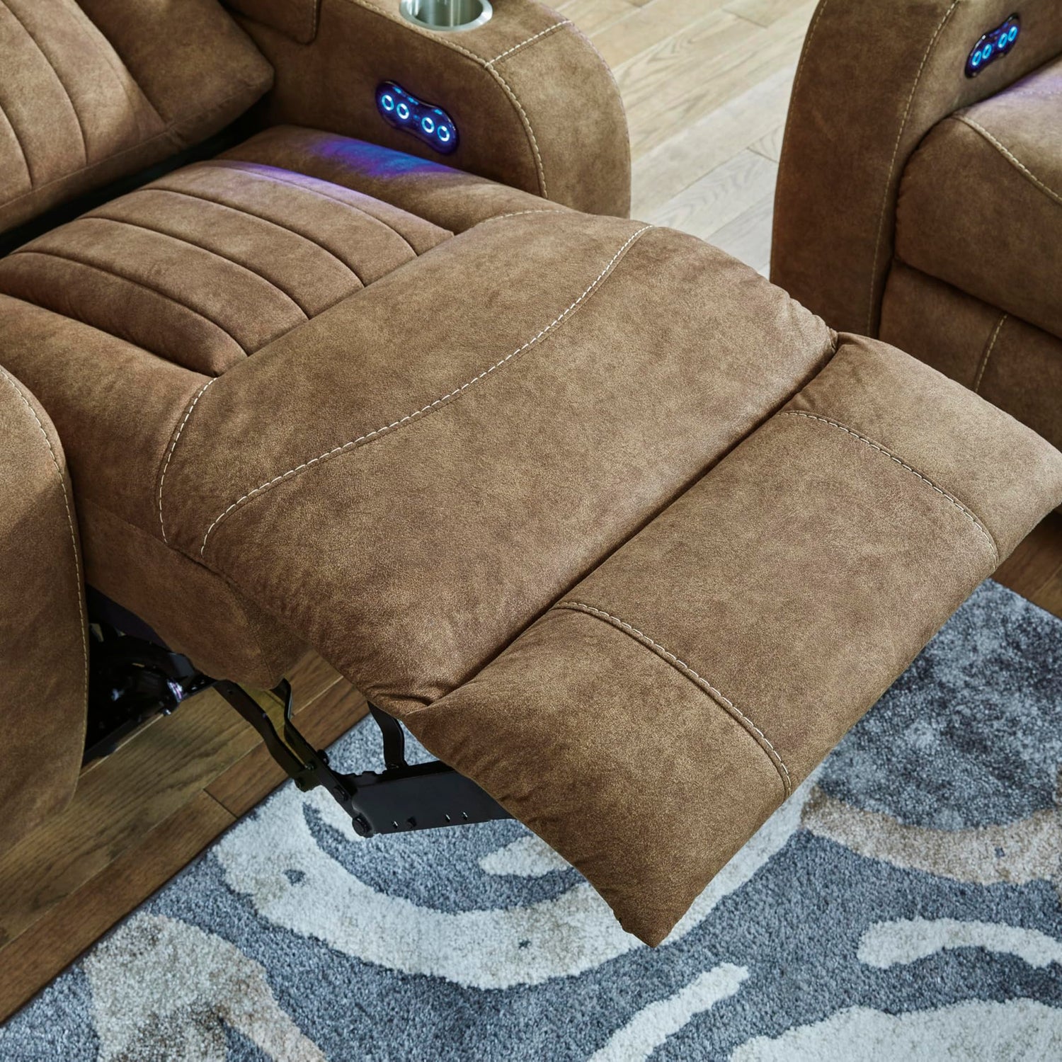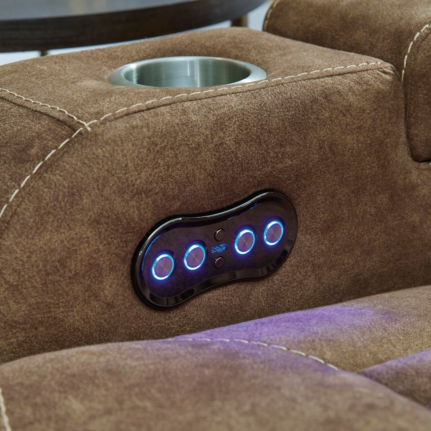 Signature Design by Ashley Wolfridge Contemporary Faux Leather Power Reclining Sofa with Drop Down Table, LED Lights, Electrical Outlet, Wireless Charging, USB Ports and Cup Holders, Light Brown