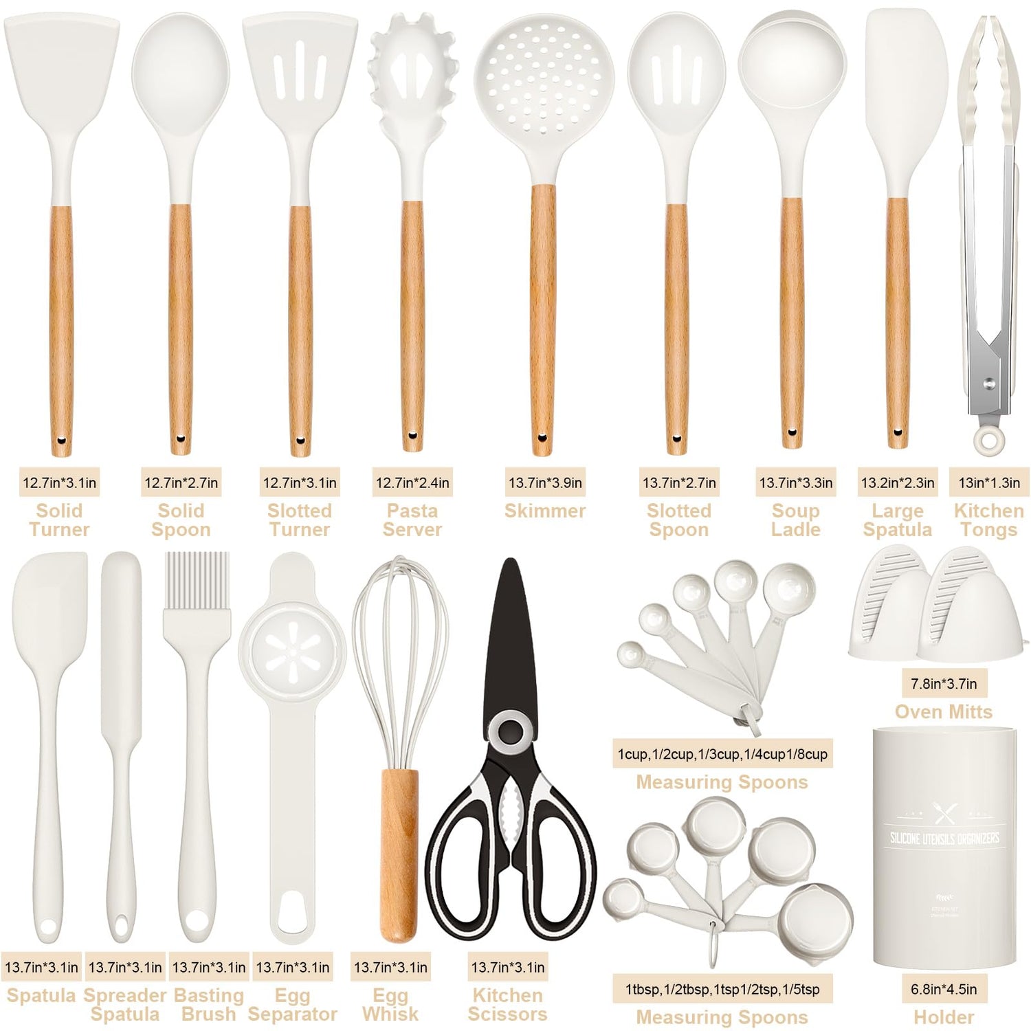 Silicone Cooking Kitchen Utensils Set, AIKKIL 28PCS White Cooking Utensils Set with Wooden Handles, Tongs, Spatula, Pasta Server, Kitchen Gadgets Tools Set For Non-Stick Cookware(BPA Free)