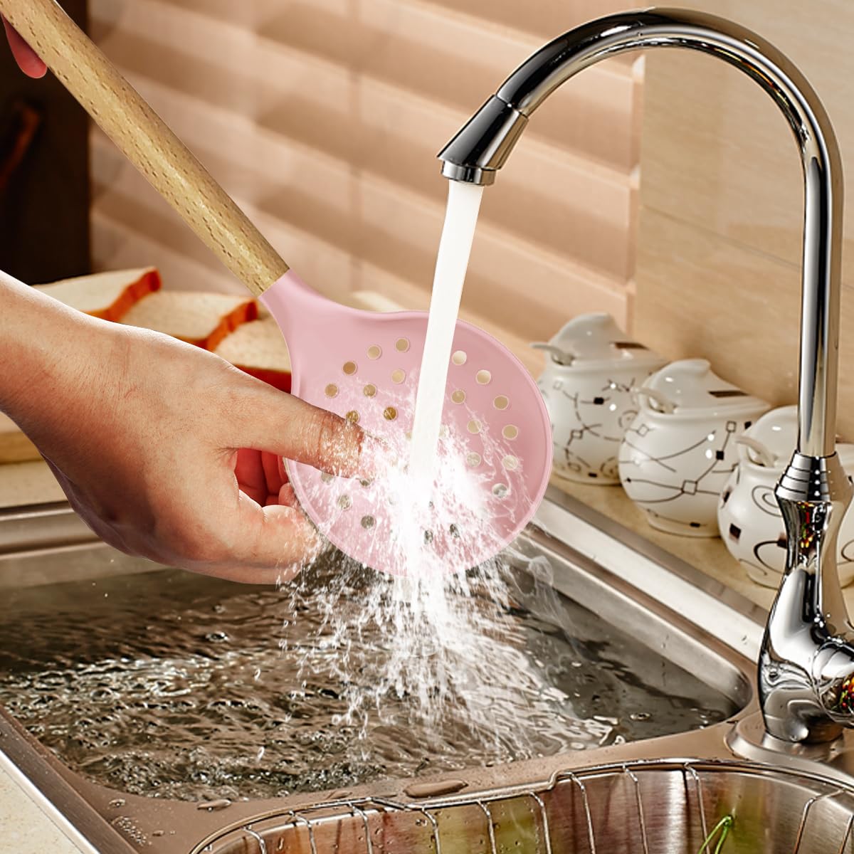 - FLEXIBLE AND UNDEFORMABLE DESIGN: Each tool in this spatula set is reinforced with a stainless steel core and fully wrapped in silicone, offering a perfect balance of strength and flexibility. This seamless design prevents food from getting trapped in crevices, ensuring easy cleaning and better hygiene. The tools retain their shape over time and are gentle on non-stick surfaces. The handles feature small holes for easy hanging and storage. For the best care, we recommend hand washing to preserve the wooden handle