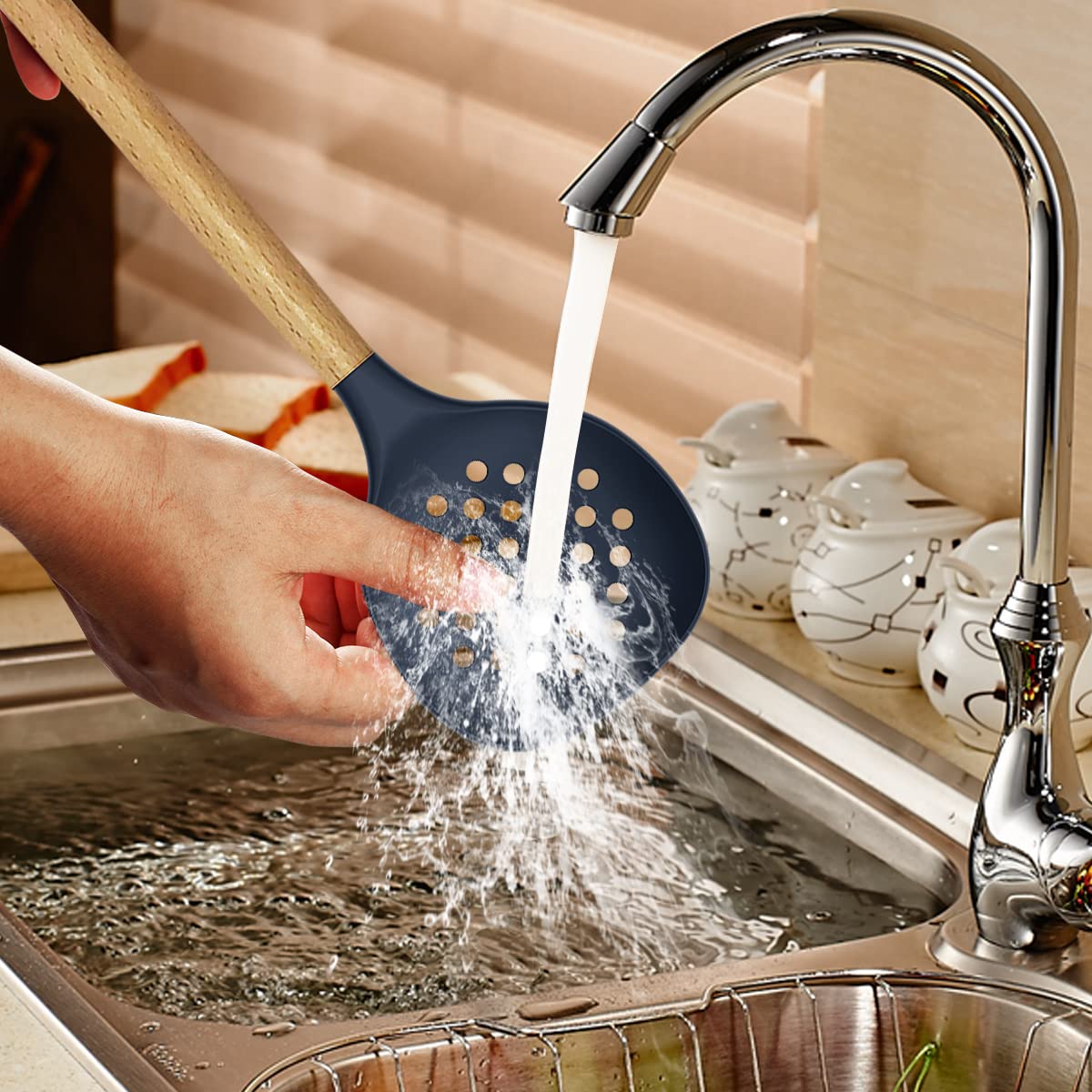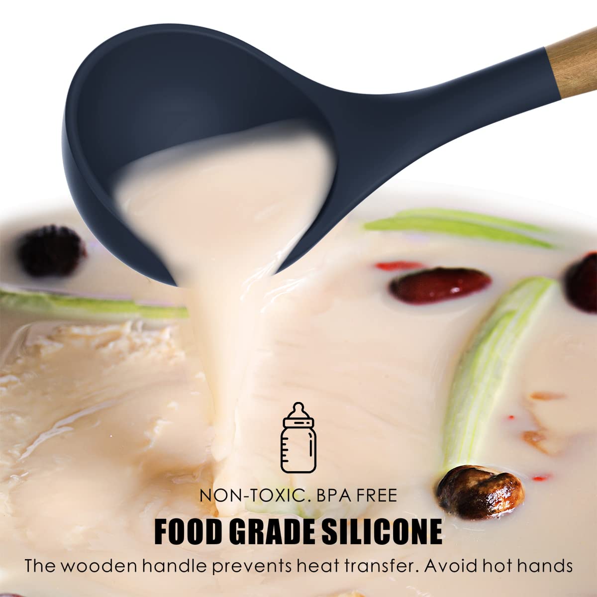 Silicone Cooking Utensils Set - 446°F Heat Resistant Silicone Kitchen Utensils for Cooking,Kitchen Utensil Spatula Set w Wooden Handles and Holder, BPA FREE Gadgets for Non-Stick Cookware (Navy Blue)