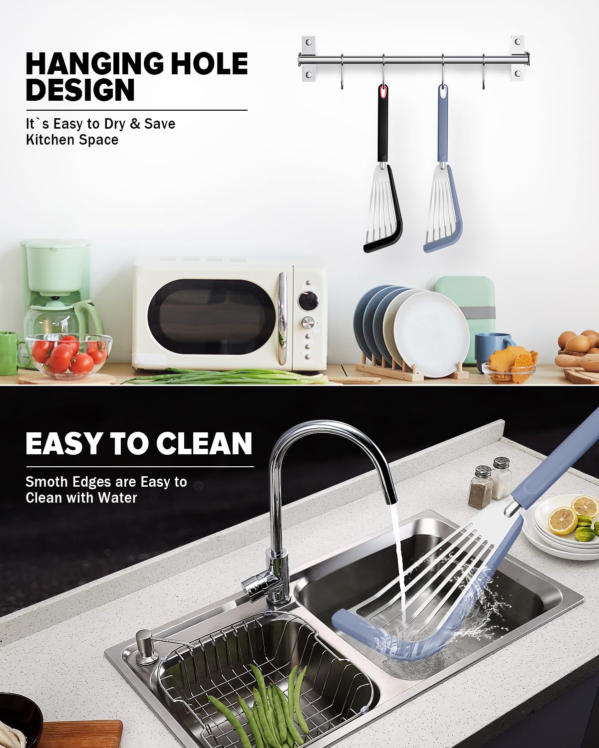 - [Ergonomic Design] Our fish spatula stainless steel is 0.8mm thin, with a curved design and long&wide beveled edges for easy to slide beneath and flip food. Bright brushed stainless steel and non-slip handles, the grip features an advanced ergonomic design, and a loop at the end is easy to hang up.