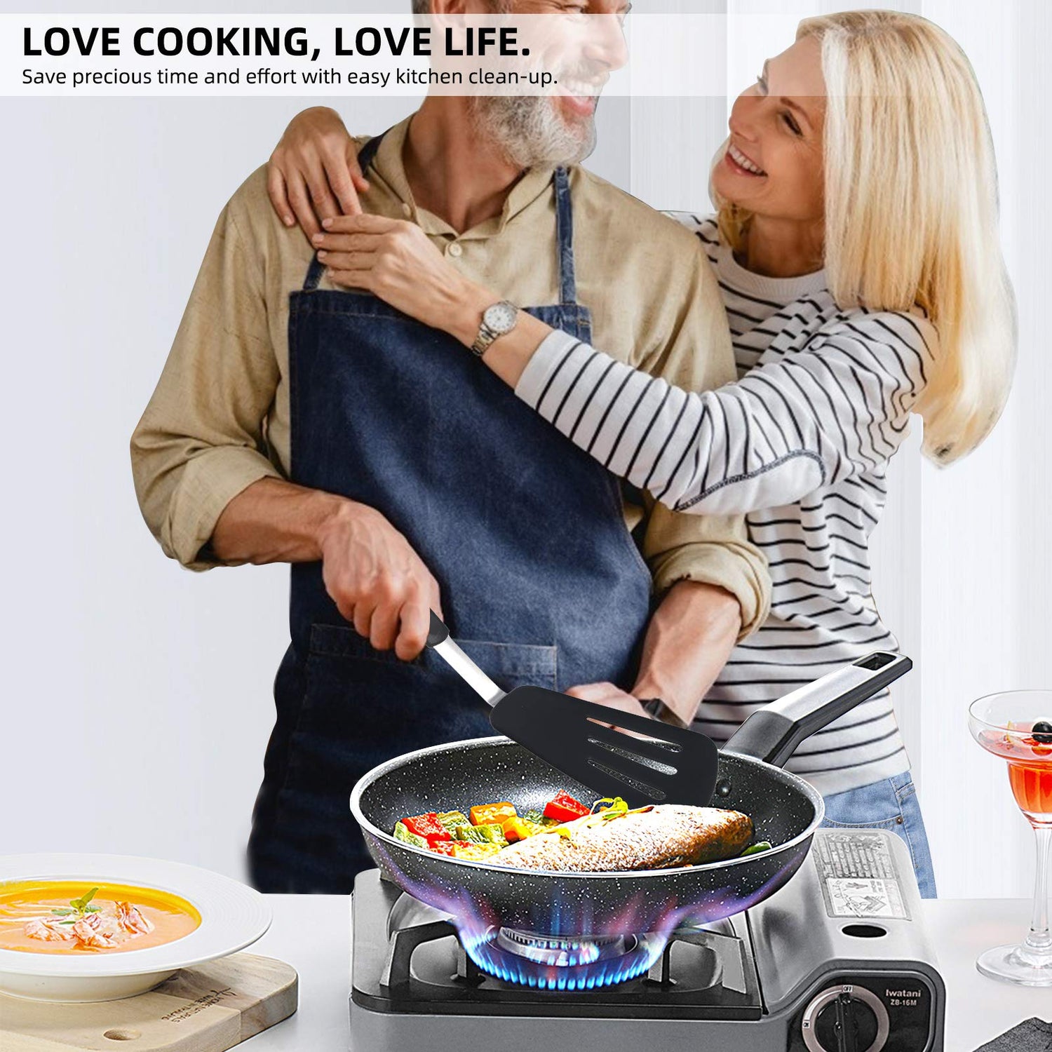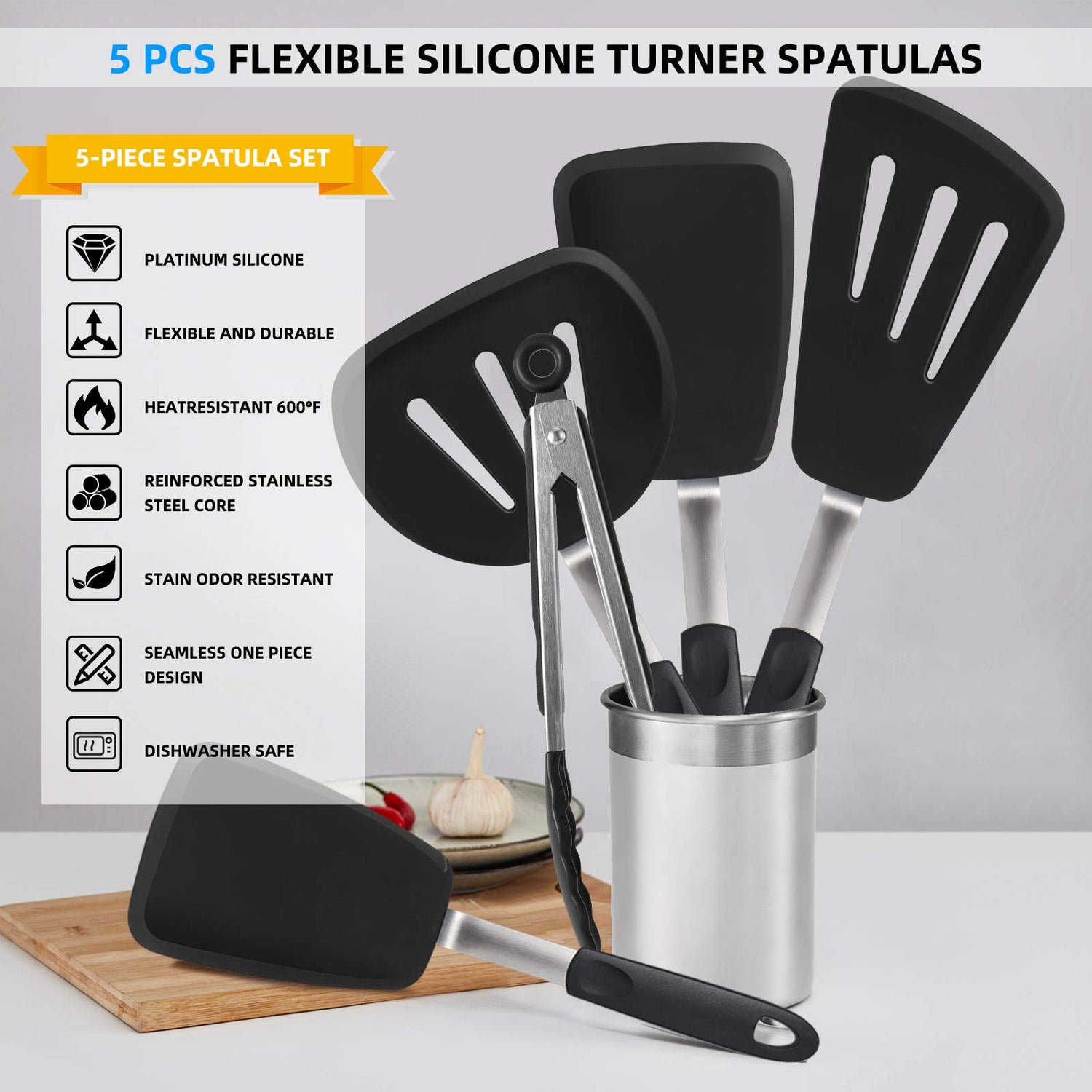 - 【Lengthened and Enlarged Silicone Turner Spatulas】Enlarge heat-resistant spatulas set of 5 makes cooking flipping easy and fun. Silicone turners spatula for non-stick cookware is perfect for flipping eggs, pancake, cooking fish, roast steak,without breaking them.