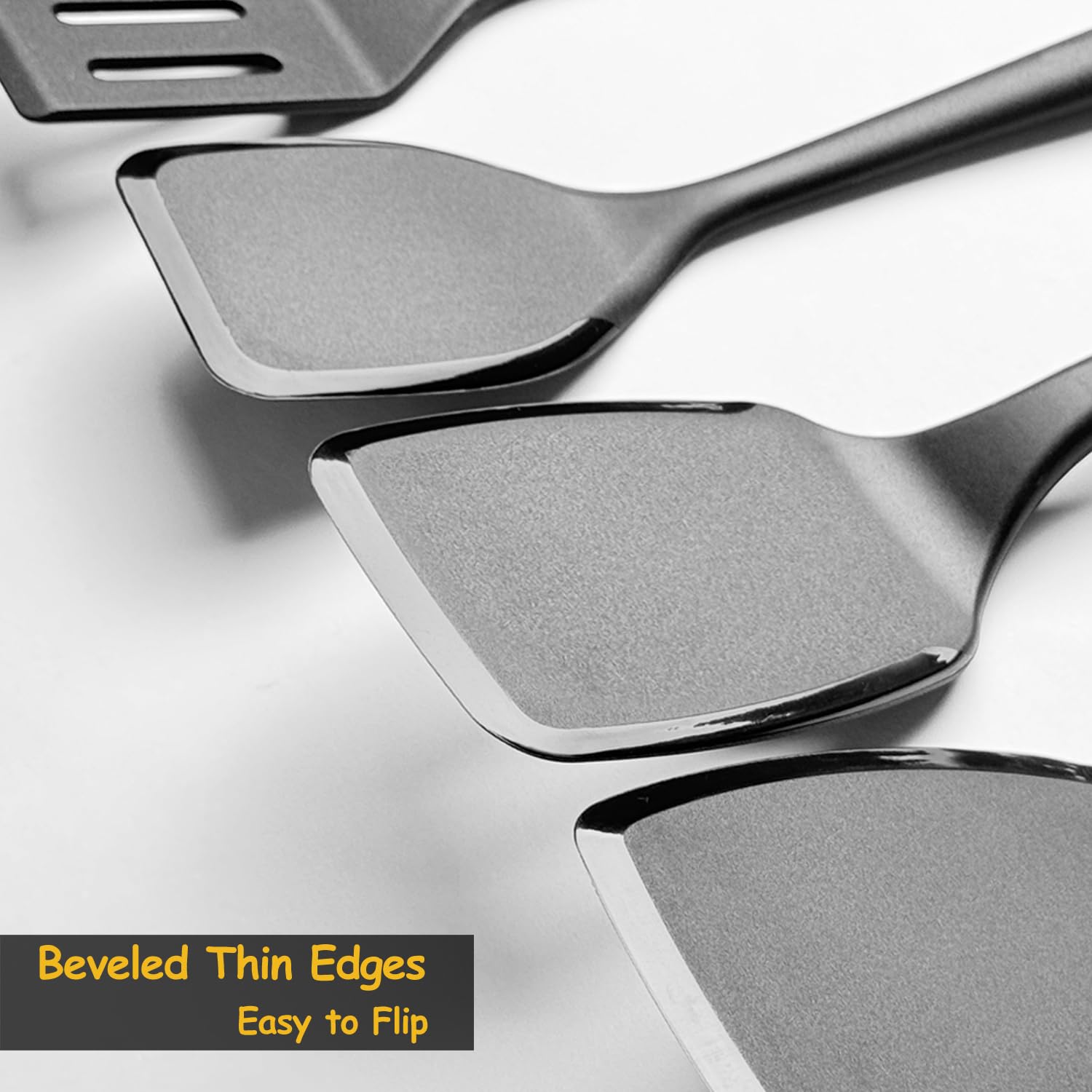 - The last turner set meet your everyday use– Each piece is expertly designed with reinforced stainless steel core for blade and nylon core for handle.So the turners is flexible and have thin blade edges,much easier to use while not compromising on durability. The ergonomic non-slip grip prevents the dreaded dropped spatula mess, will fit like a glove in your hand, and will not bend or break.