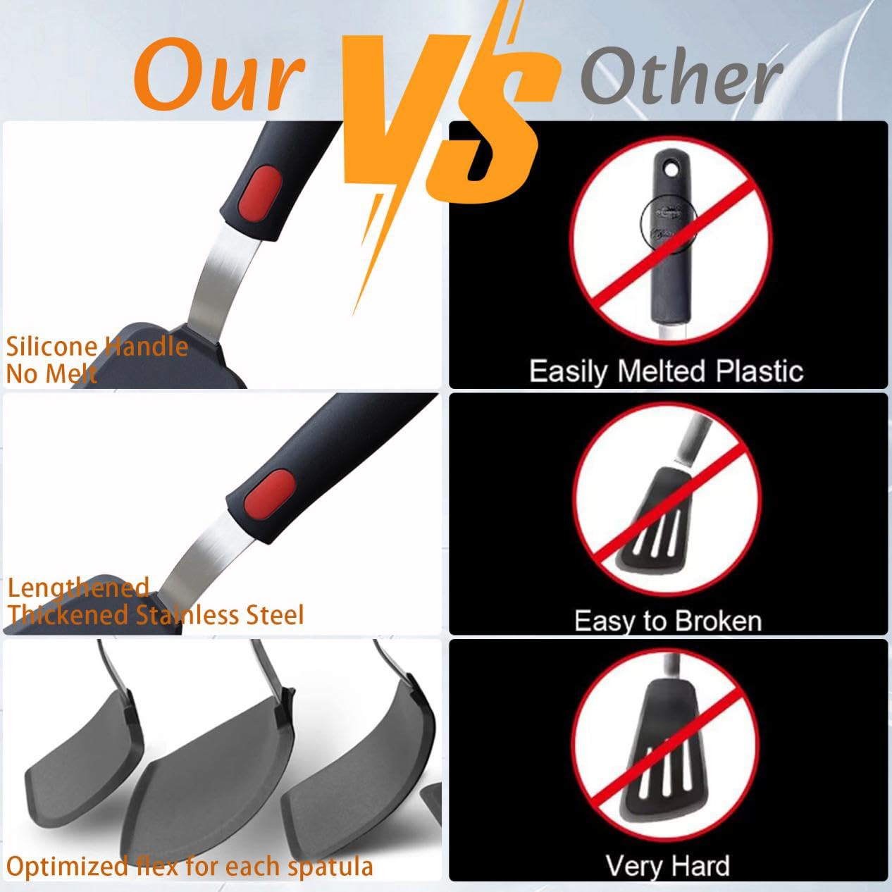 - 600°F Heat Resistant Silicone Spatulas: One of the advantages of using a silicone spatula turner is its high heat resistance. Silicone can withstand high temperatures, often up to 600°F, which makes it suitable for use with hot pans and grills. This heat resistance ensures that the spatula turner won't melt or warp while cooking.