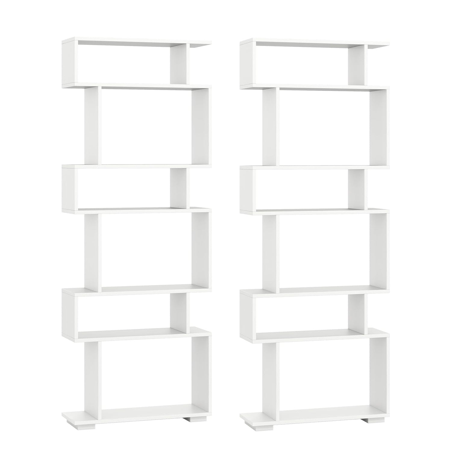 SILKYDRY 6 Tier S Shaped Bookshelf, Wood Geometric Bookcase, Modern Room Divider and Display Shelf, 64" Tall Staggered Bookshelf for Bedroom Living Room Office Study (2, White)