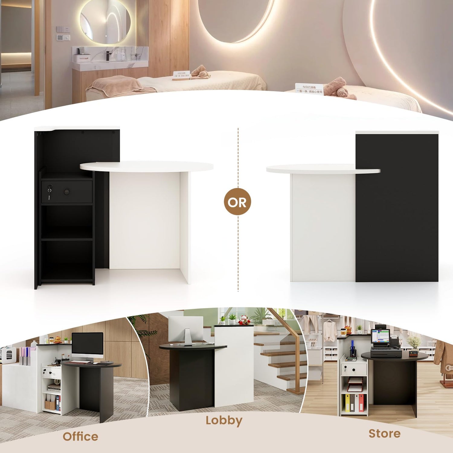 - [Check Out Stand for Small Businesses]: Crafted to provide optimal workspace and privacy, our front desk reception counter is the perfect solution for all your business needs. This salon reception desk includes an oval-shaped computer desk, an L-shaped elevated hutch, a lockable drawer, and two storage compartments with adjustable shelves, offering a vast amount of space for storage.