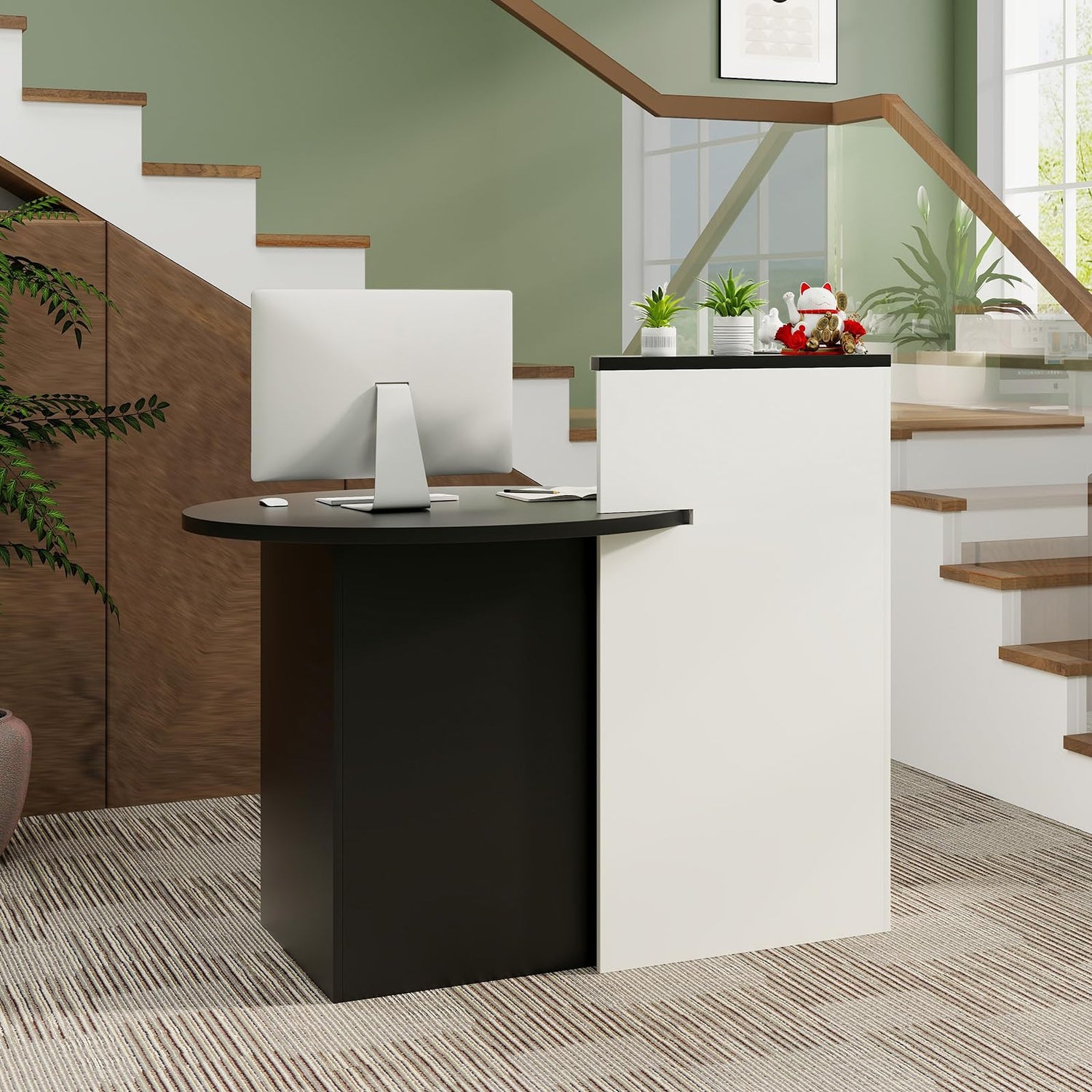 - [Modern Workstation for Wide Use]: Through a simple contrast of black and white colors, the perception of space is amplified. The minimalist front desk design can easily adapt to any style or theme. It serves as a computer desk as well as a counter and bookcase, perfect for corporate lobbies, retail stores, restaurants and reception rooms.