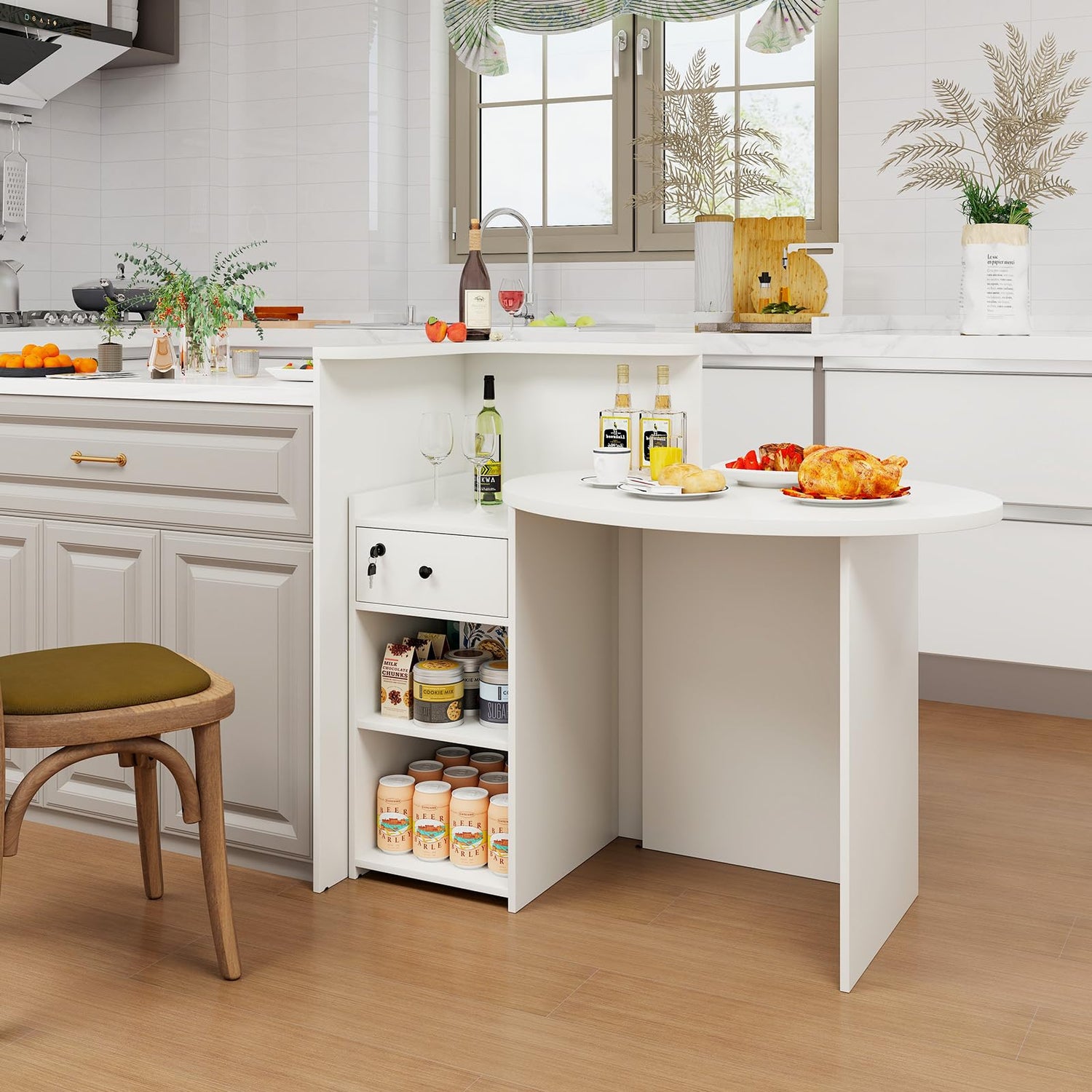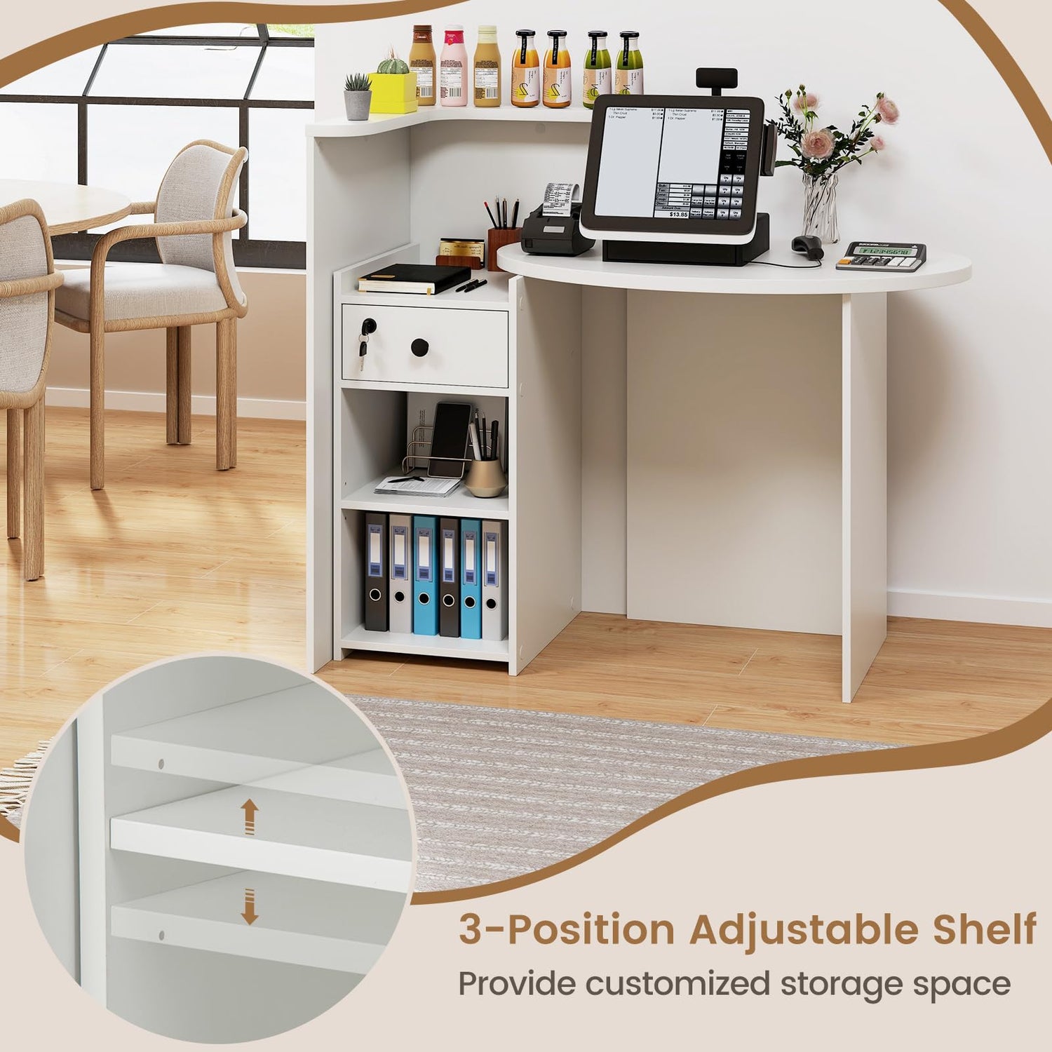 SILKYDRY Reception Desk, Small Retail Checkout Counter with Lockable Drawer and Open Shelves, Wooden Front Desk Reception Counter, Oval Desktop & L Counter for Store Office Lobby Salon (White)