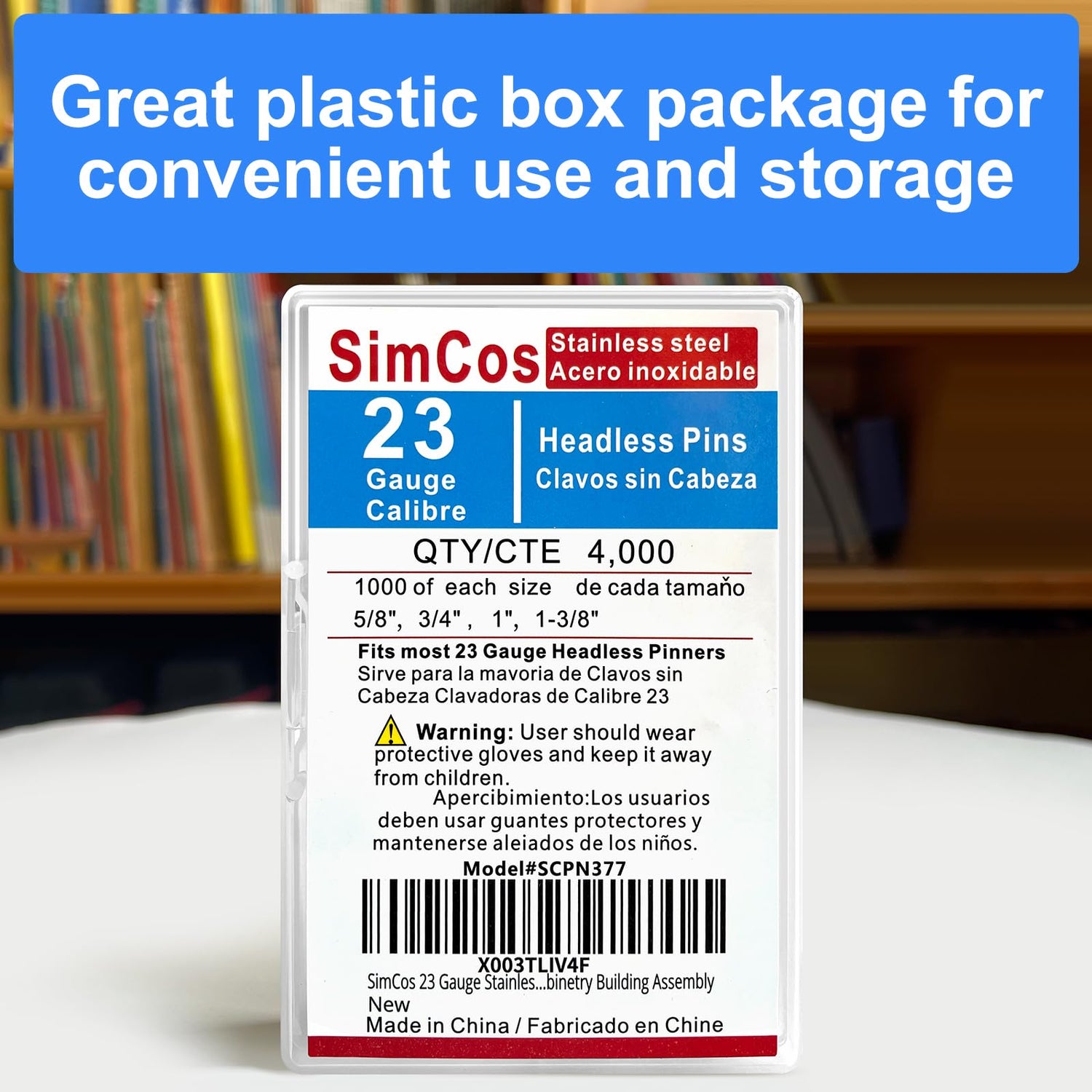 SimCos 23 Gauge Stainless Steel Pinner Nails (5/8",3/4",1",1-3/8") assorted 4 sizes' Headless Pin Nails for 23 GA Pneumatic or Electric Pin nailer or pin nail gun,Project Pack (4000)