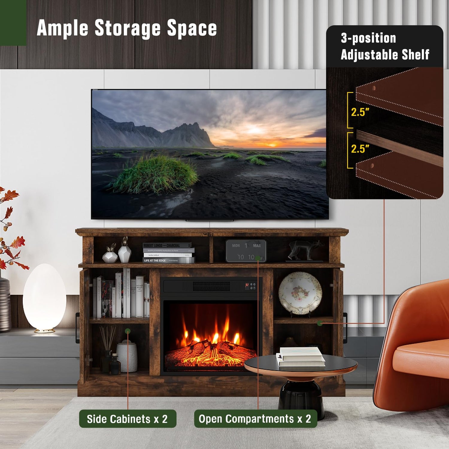 - 📺Sturdy TV Stand: Size: 48” x 16” x 30” (L*W*H). Fireplace TV stand with cabinets is made of sturdy material, which can hold up to 50’’ TVs. Classic appearance makes the TV cabinet more artistic atmosphere, suitable for all rooms. Easy installation and use.