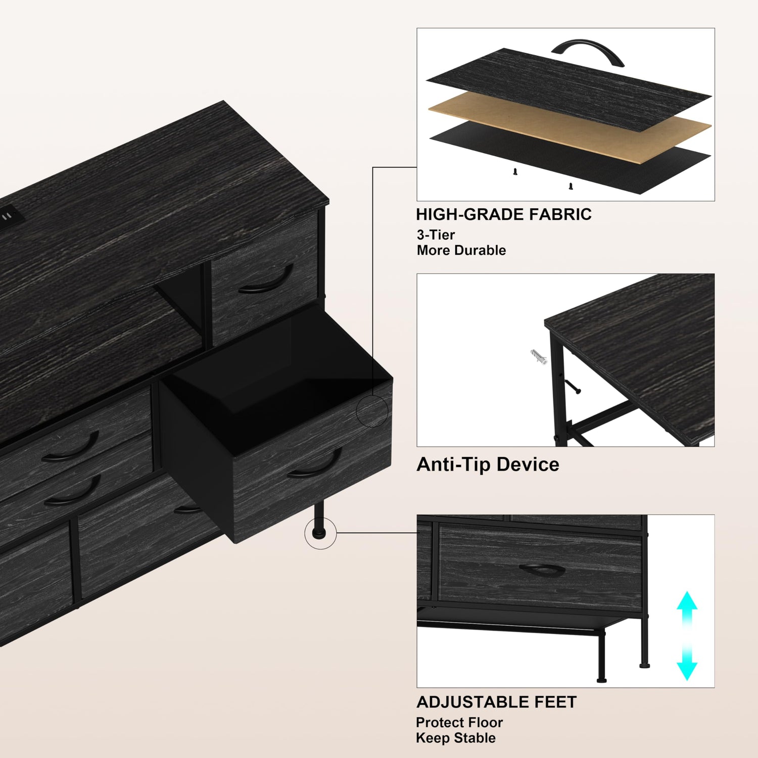 - Sturdy and Stable: This dresser is made of high-quality engineered board and iron frame, ensuring stability and durability. The anti-tipping hardware and adjustable feet provide added safety.