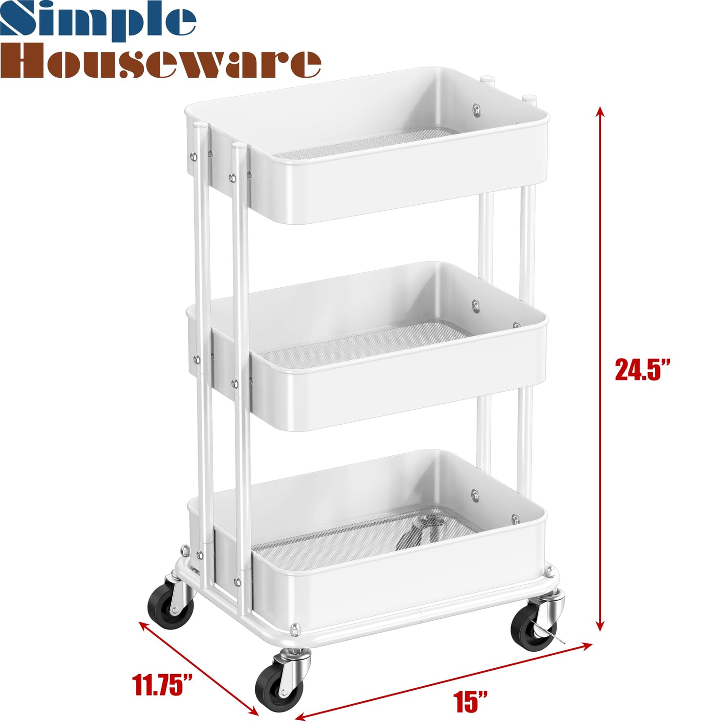 Simple Houseware 3-Tier Compact Utility Rolling Cart, Low 24” Height Fits Under Desk, Space-Saving Storage for Home Office, Dining Room, or Kitchen, White