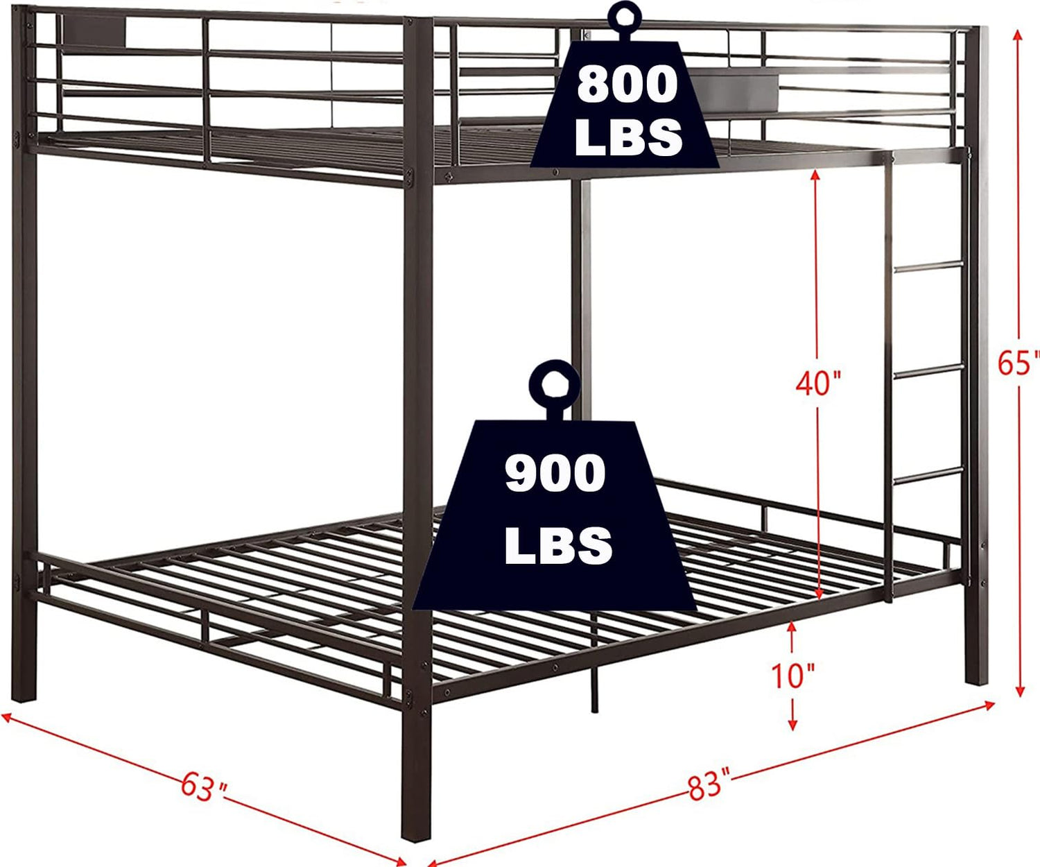 - Higher quality steel bunk bed: The whole bed frame is made of steel with ultimate strength. With steel reinforcement is ideal for complete safety and ultimate comfort. Modern and safe design with 4 sturdy poster legs and Our experiments show that the maximum weight capacity of the upper bed is 800lbs, and the maximum weight capacity of the lower bed is 900lbs.