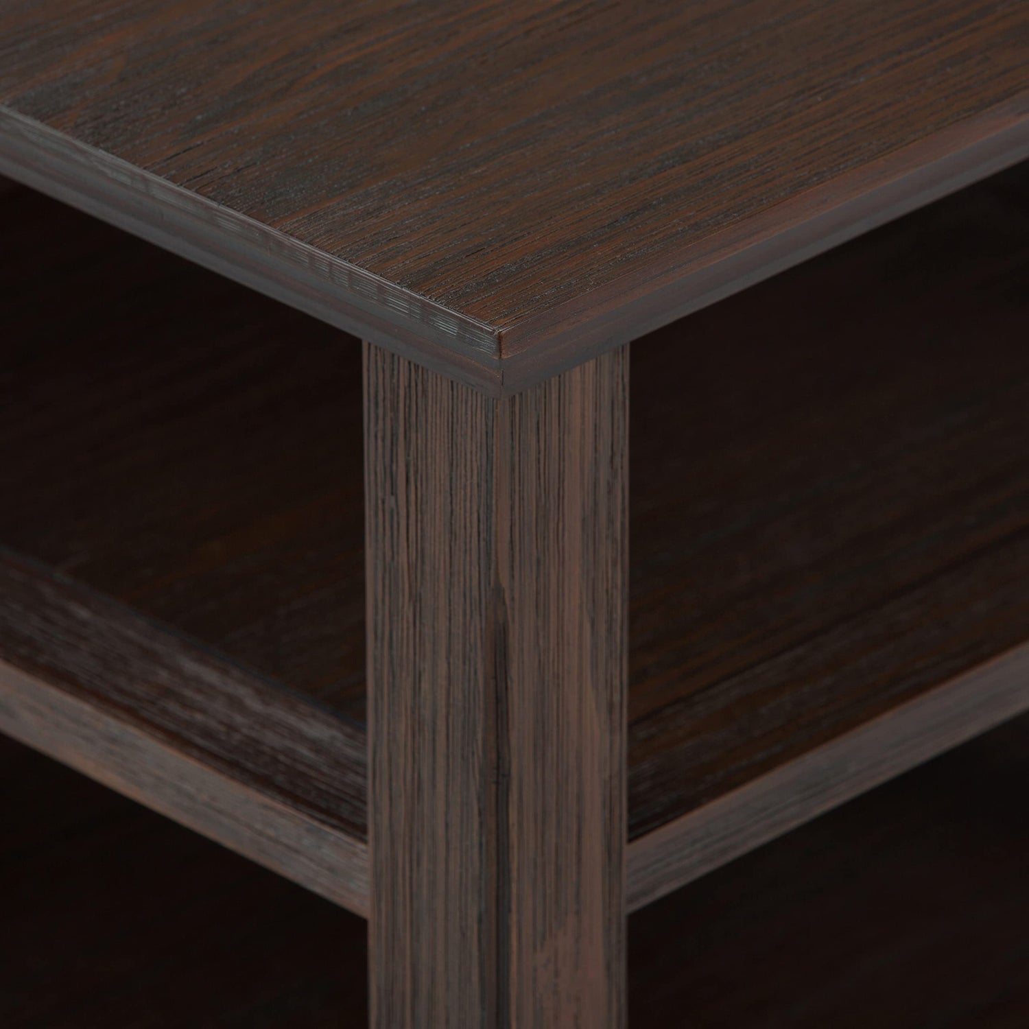 Details: Good things really do come in small packages. Nothing could illustrate this better than the design of our Acadian End Table which features two open shelves providing plenty of storage space. The table is sized perfectly to allow room for a table lamp, book and family photos. A perfect companion to any sofa or arm chair. This flexible piece can also be used as a bedside table or in multiple other settings.Rustic Contemporary Style includes elegantly tapered legs and ed crown edged table top. Assembly required. Efforts are made to reproduce accurate colors, variations in color may occur due to computer monitor and photography. At Simpli Home we believe in creating excellent, high quality products made from the finest materials at an affordable price. Every one of our products come with a 1-year warranty and easy returns if you are not satisfied.