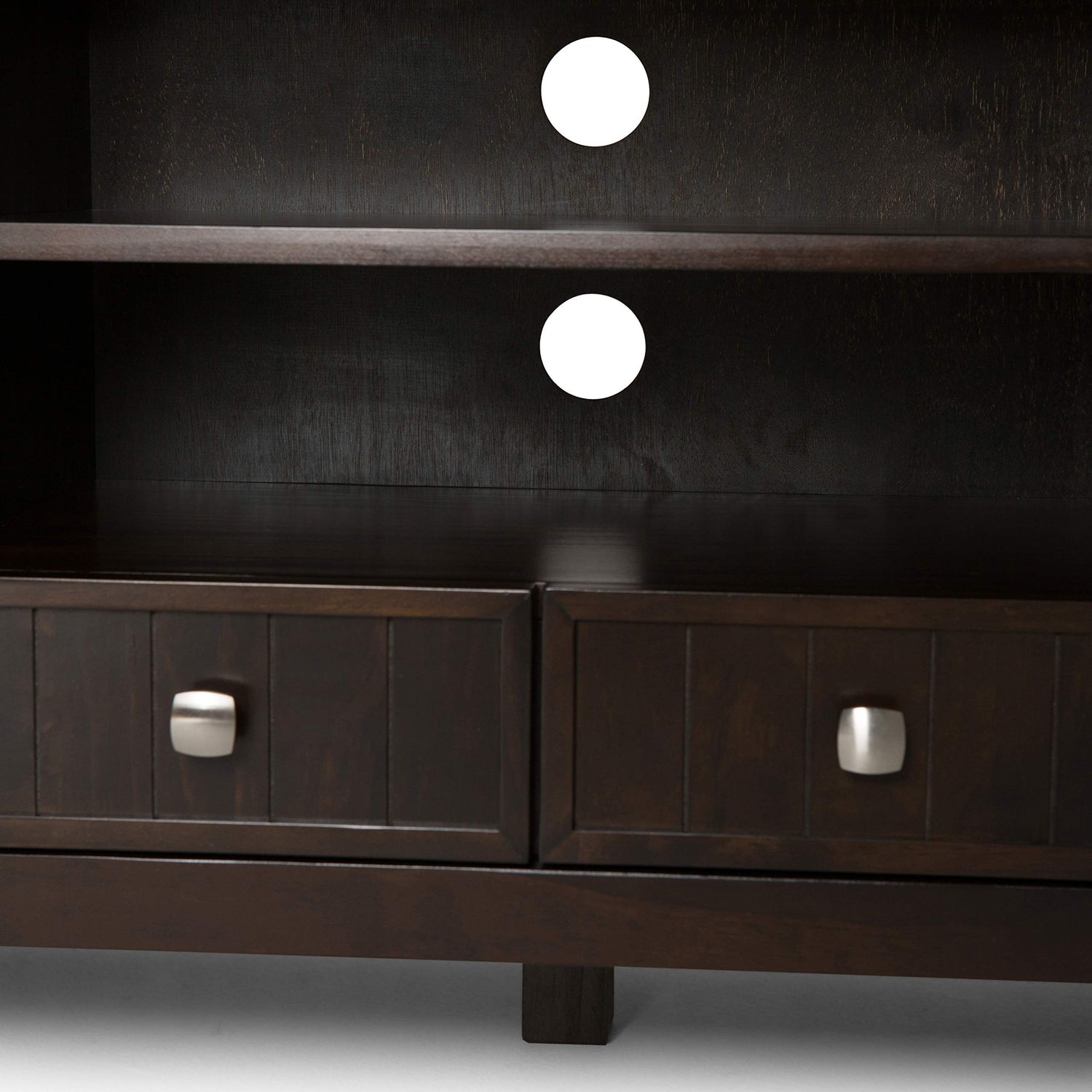 Details: Having just purchased your dream large flat screen TV - you need the perfect TV Stand to enhance your viewing pleasure. Look no further. The Acadian TV Stand is perfectly sized for TVs up to 65 inches. The Acadian TV Stand has plenty of storage and space for all your media and gaming devices. It has a large centrally located open area with one adjustable shelf and two drawers. The two large side storage cabinets open to adjustable shelves. The unit features cord management cut-outs for easy installation of TV and media components. Open center with two adjustable shelves and cord management cutouts for easy installation of TV and media components. Style includes elegantly tapered legs, grooved sides, molded crown edged table top and Brushed Nickel rounded square knobs. Efforts are made to reproduce accurate colors, variations in color may occur due to computer monitor and photography. At Simpli Home we believe in creating excellent, high quality products made from the finest materials at an affordable price. Every one of our products come with a 1-year warranty and easy returns if you are not satisfied.
