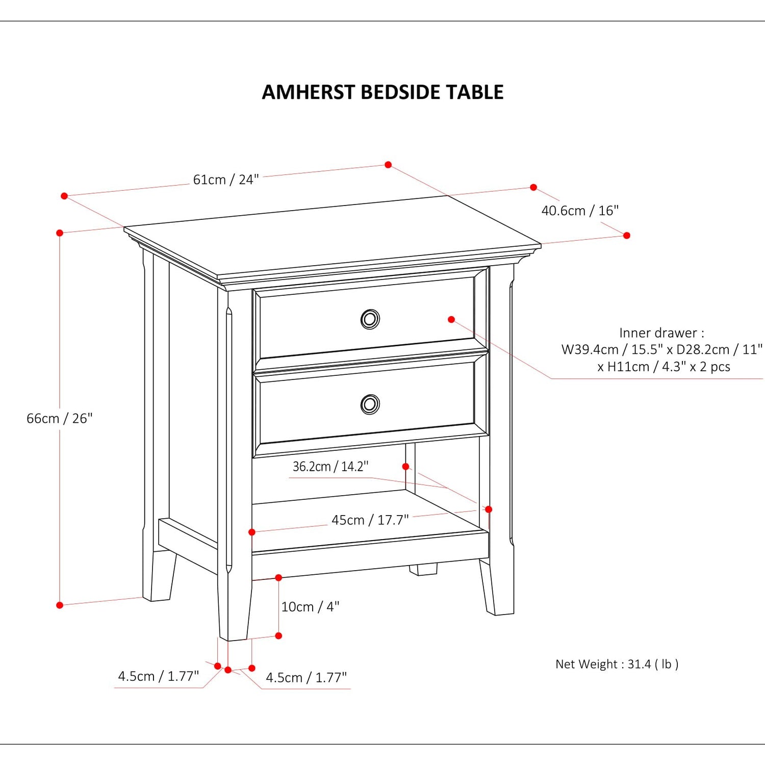 Details: Keep your bedtime essentials within reach on the Amherst bedside table. The ideal bedside accessory, The nightstand has two drawers for concealed storage of small items as well as an open shelf on the Bottom for books and larger items. Constructed of solid wood, this product is a sturdy piece that's fit wonderfully into your bedroom, living or family room décor. ; efforts are made to reproduce accurate colors, variations in color may occur due to computer monitor and photography; at Simpli Home we believe in creating excellent, high quality products made from the finest materials at an affordable price. Every one of our products come with a 1-year and easy returns if you are not satisfied