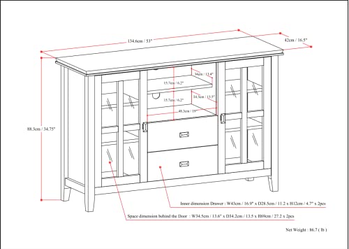 Details: You just bought the ultimate large flat screen TV. Now what to do? Hang it on the wall? No, you need the perfect TV Stand for storage and to enhance your viewing pleasure. Look no further than our most popular Artisan TV Stand. It is perfectly sized for TVs up to 60 inches. The 35 inch height puts the TV at a level that is ideal for comfortable viewing. The Artisan TV Stand has plenty of storage and space for all your media and gaming devices. It has a large centrally located open area with one adjustable shelf and two drawers. The two large side storage cabinets open to two adjustable shelves. The unit features cord management cut-outs for easy installation of TV and media components. Easy installation of TV and media components. Style includes clean angle edged table top with distinctive contemporary look, mullion framed tempered glass doors, square and slightly tapered legs and rectangular Antique Bronze knobs. Efforts are made to reproduce accurate colors, variations in color may occur due to computer monitor and photography. At Simpli Home we believe in creating excellent, high quality products made from the finest materials at an affordable price. Every one of our products come with a 1-year warranty and easy returns if you are not satisfied.