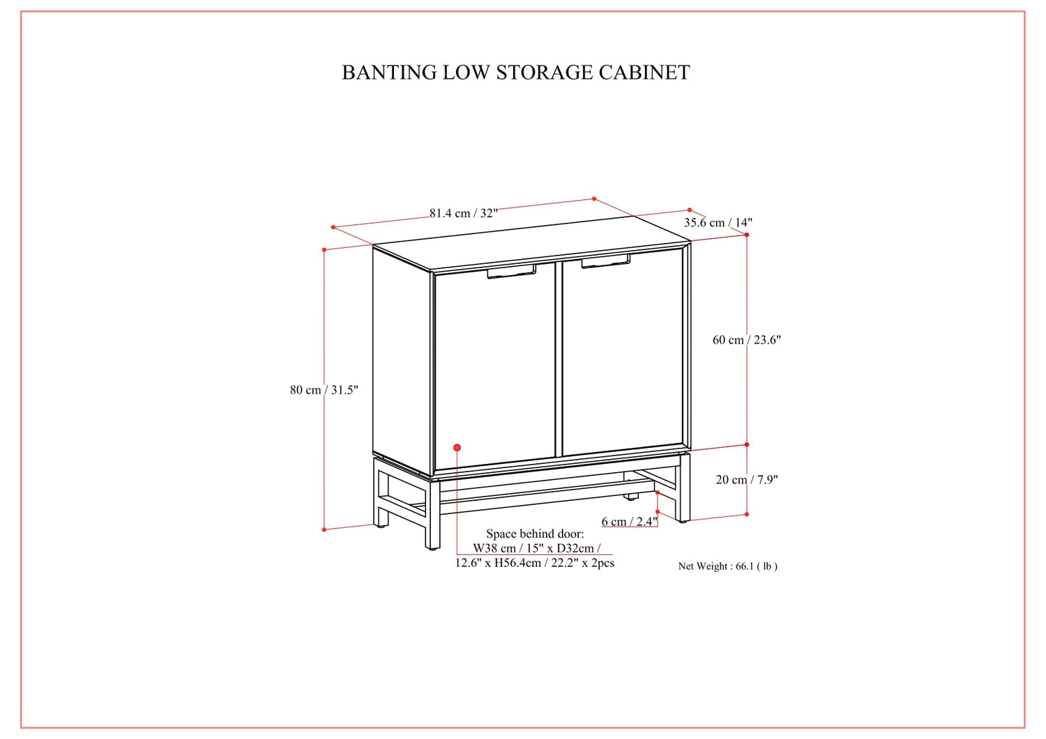 Details: Keep a low profile and store books, games, dinnerware, drinkware and even toys in this versatile Banting Low Storage Cabinet. The cabinet is crafted of solid hardwood and metal. Notched handle doors open to reveal a spacious interior with adjustable shelves. This cabinet, at only 31.5 inches tall, could fit almost anywhere in your home to provide extra storage space.