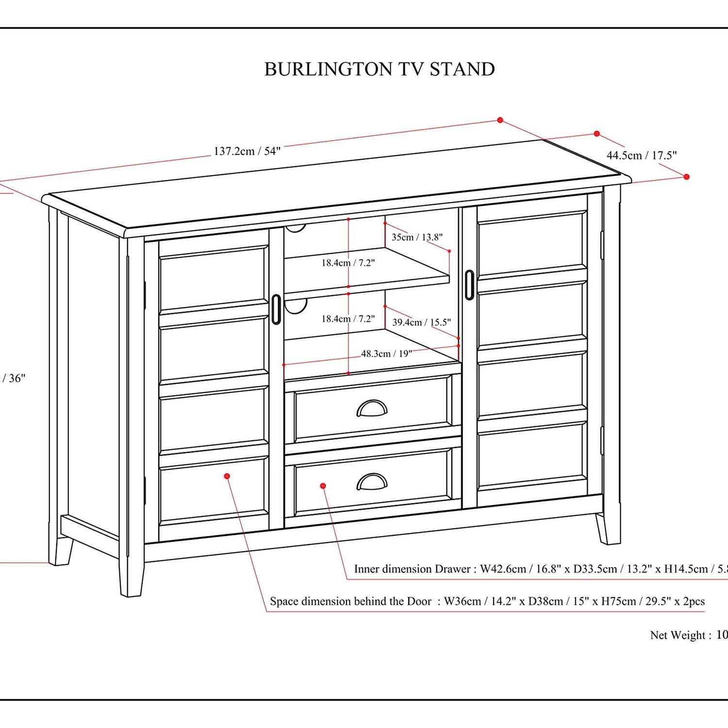 Details: You just bought the ultimate large flat screen TV. Now what to do? Hang it on the wall? No, you need the perfect TV Stand for storage and to enhance your viewing pleasure. Look no further than our popular Burlington TV Stand. It is perfectly sized for TVs up to 60 inches and its 36 inch height puts the TV at a level that is ideal for comfortable viewing. The Burlington TV Stand has plenty of storage and space for all your media and gaming devices. It has a large centrally located open area with one adjustable shelf and two drawers. The two large side storage cabinets open to two adjustable shelves. The unit features cord management cut-outs for easy installation of TV and media components .Cord Management Cutouts to allow for neat & organized look for the wires from all your devices. Style includes rounded molded table top, ladder framed doors and drawers, square and slightly tapered legs and Antique Bronze classic drawer pulls. Efforts are made to reproduce accurate colors, variations in color may occur due to computer monitor and photography. At Simpli Home we believe in creating excellent, high quality products made from the finest materials at an affordable price. Every one of our products come with a 1-year warranty and easy returns if you are not satisfied.