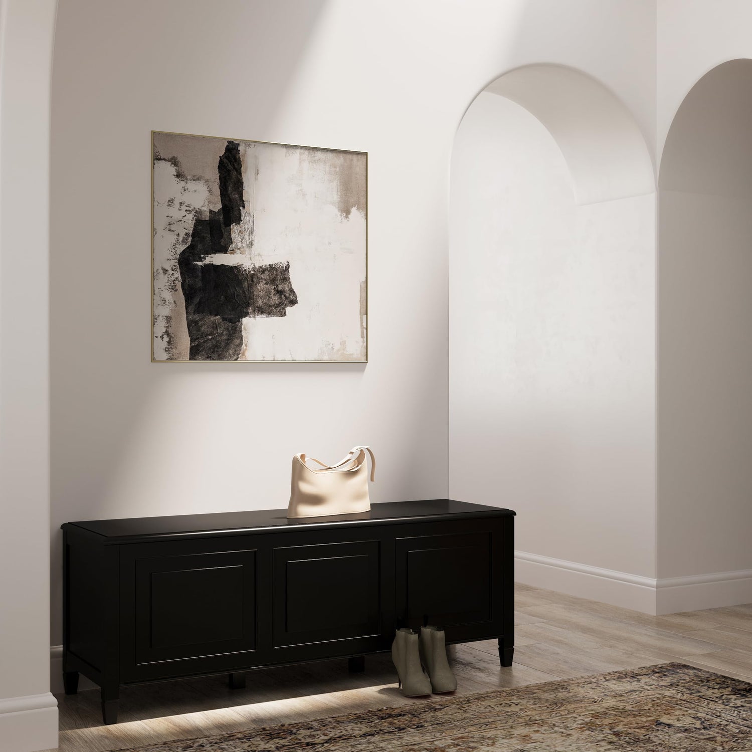 Details: Overwhelmed by junk? Need help organizing the clutter and keeping it out of sight? The Connaught Storage Bench Trunk is a versatile furniture piece that can be used throughout your home. Whether in the family room, bedroom, hallway, kids room, or den, this trunk is the perfect solution to store anything. Its lid with child safety hinges opens to reveal three large storage compartments. Beautifully crafted from solid wood, its classic design details lend a timeless look to any room.