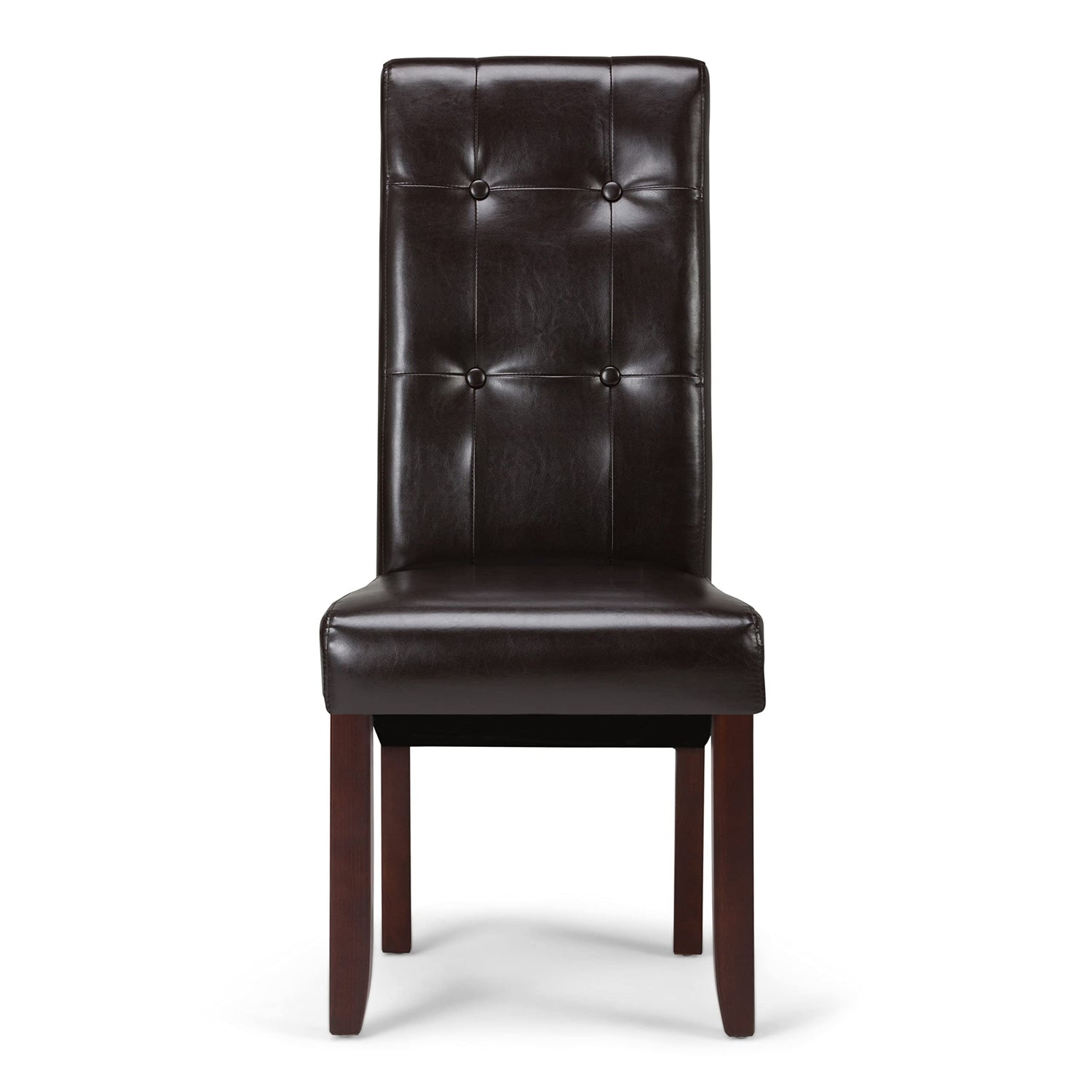 Details: What you need is an affordable and attractive dining chair to match your dining table. The Cosmopolitan Parson Chair is an upgraded beautiful, well made seating solution with tufted upholstery, curved back and bottom details. It is made from durable Tanners Brown Faux Leather and features a beautiful stitched exterior. Whether you use this parson chair in your dining room, kitchen, office or basement, this chair is an easy to assemble and stylish answer to your needs.; Efforts are made to reproduce accurate colors, variations in color may occur due to computer monitor and photography; At Simpli Home we believe in creating excellent, high quality products made from the finest materials at an affordable price. Every one of our products come with a 1-year warranty and easy returns if you are not satisfied