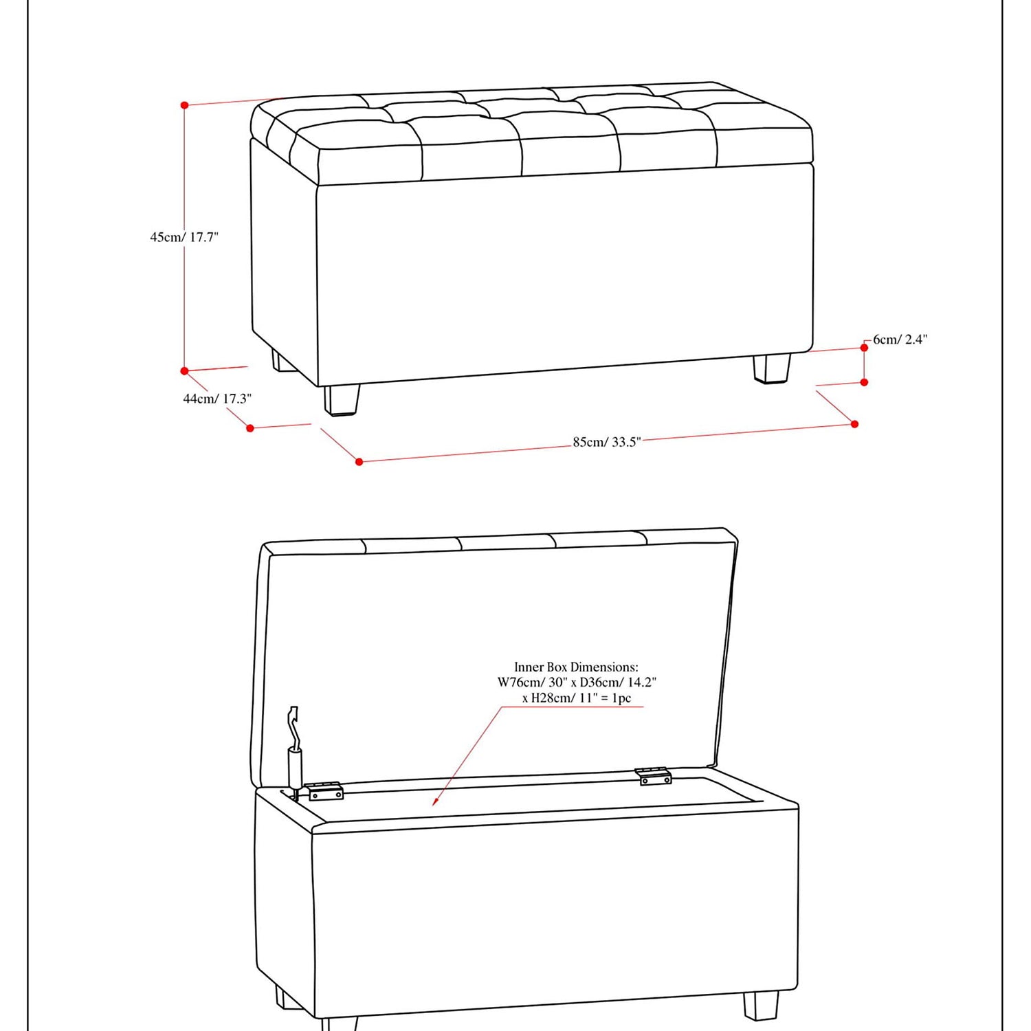 Details: Why sacrifice function for beauty. For a stylish solution to your storage needs, look no further than the Cosmopolitan Rectangular Storage Ottoman. The unit is made from durable Faux Leather or Fabrics and is extra strong and durable featuring a beautiful tufted exterior and large storage interior. Whether you use this ottoman in your entryway, living room, family room, basement or bedroom, it will allow you to hide away all that mess.