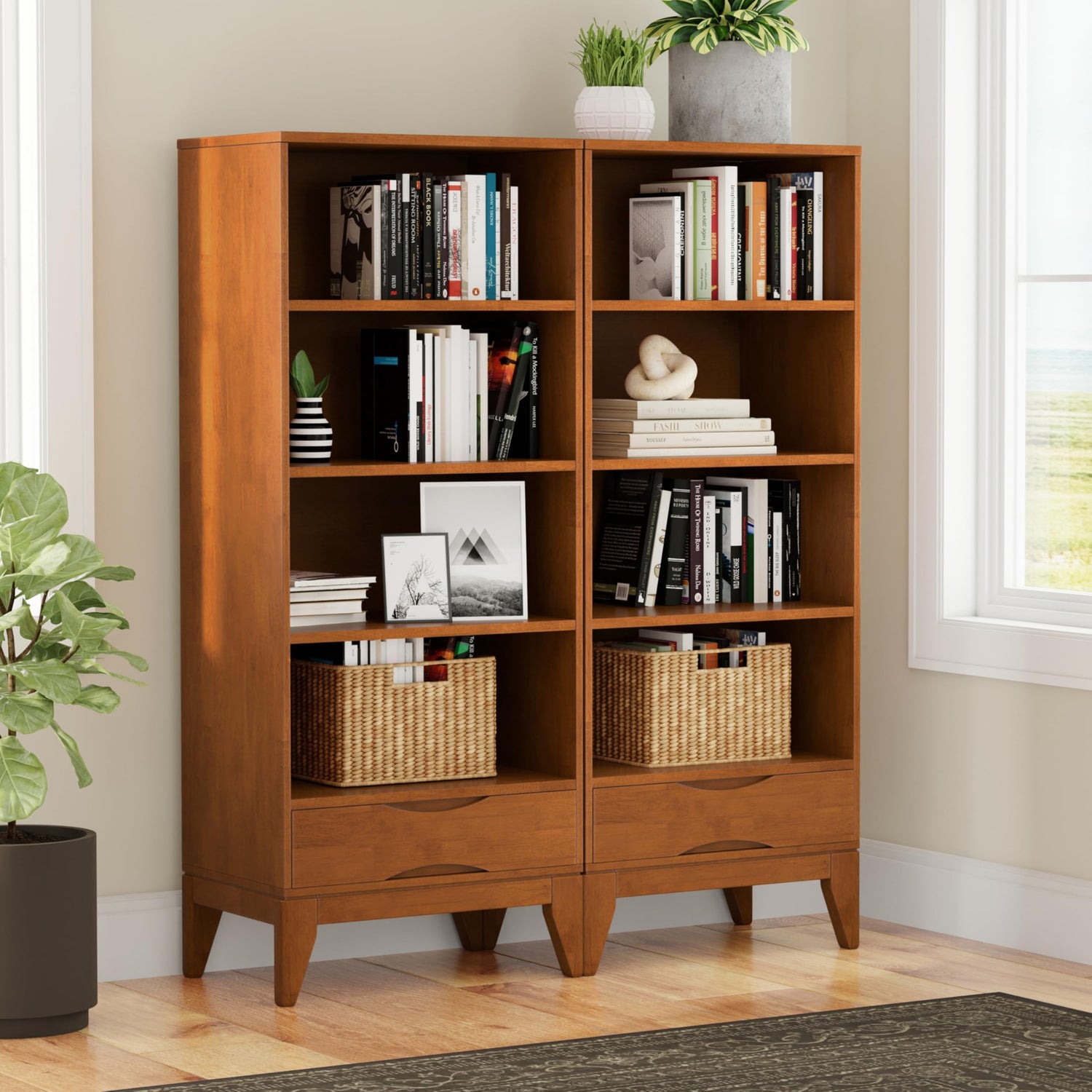 SIMPLIHOME Harper 24 inch Mid-Century Modern 4 Shelf Bookcase with Drawer (Set of 2) in Teak Brown for The Living Room, Study Room and Office