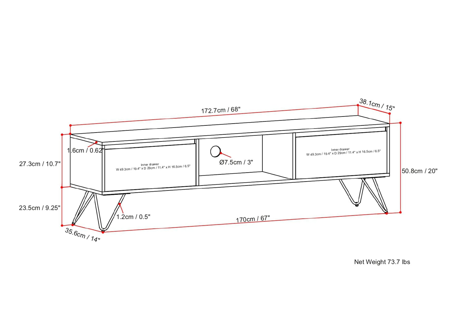 Details: Clean-lined design meets industrial chic with the Hunter 68” TV Media Stand. Hand crafted with a combination of solid Mango Wood and sturdy metal hairpin legs. The open shelving and hidden storage compartments make it easy to stay organized and wire free. Ideal for storing gaming and media accessories. Perfect for TV’s up to 70 inches this media unit brings function and style to any den or living room.