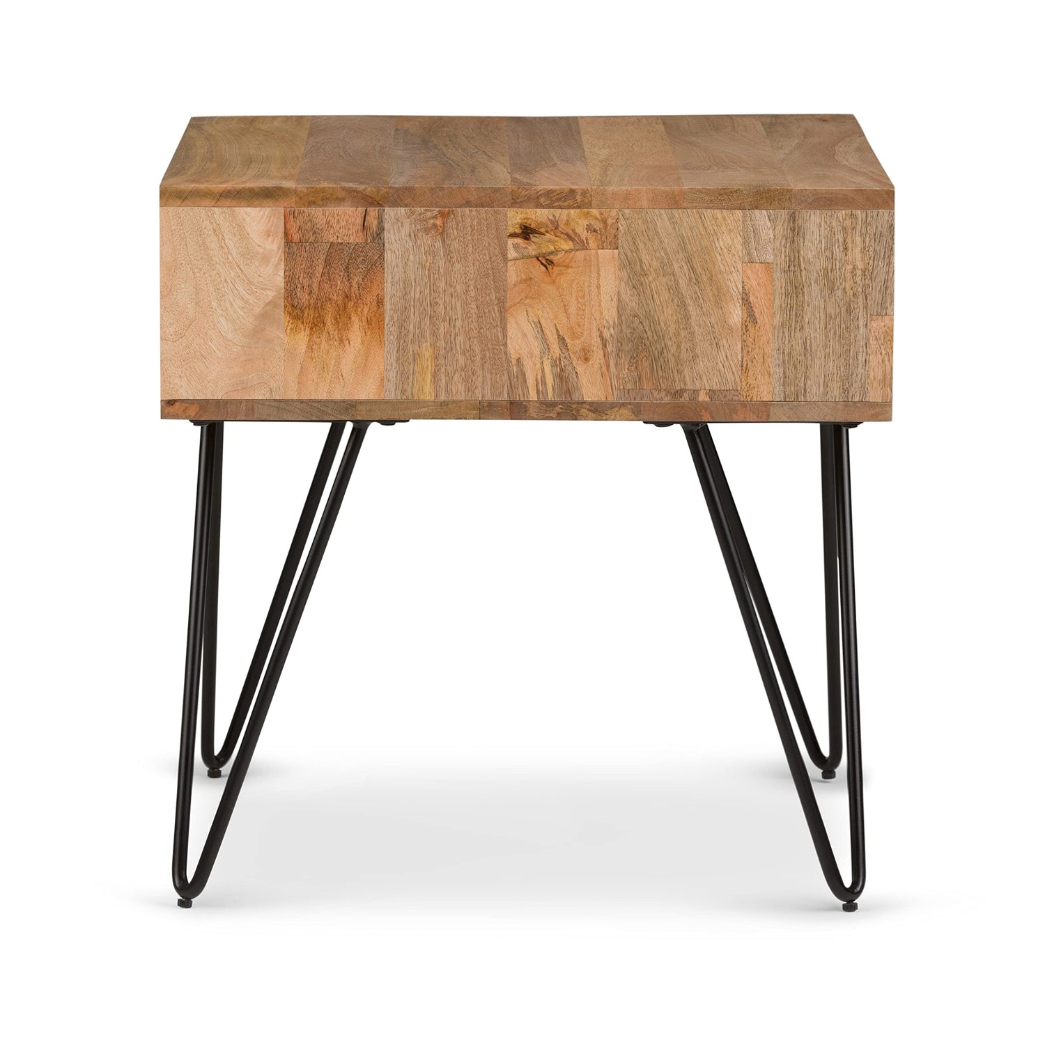Details: Accentuate your living space with the trendy Hunter End Table. The metal hairpin legs and natural Mango Wood top are the perfect combination to create an industrial, modern piece. The open compartment provides plenty of space for storage. Whether you need a place for your favorite book, night lamp or drink – this is the piece of furniture for you.Industrial contemporary design. Simple assembly; just attach legs. Efforts are made to reproduce accurate colors, variations in color may occur due to computer monitor and photography. At Simpli Home we believe in creating excellent, high quality products made from the finest materials at an affordable price. Every one of our products come with a 1-year warranty and easy returns if you are not satisfied.