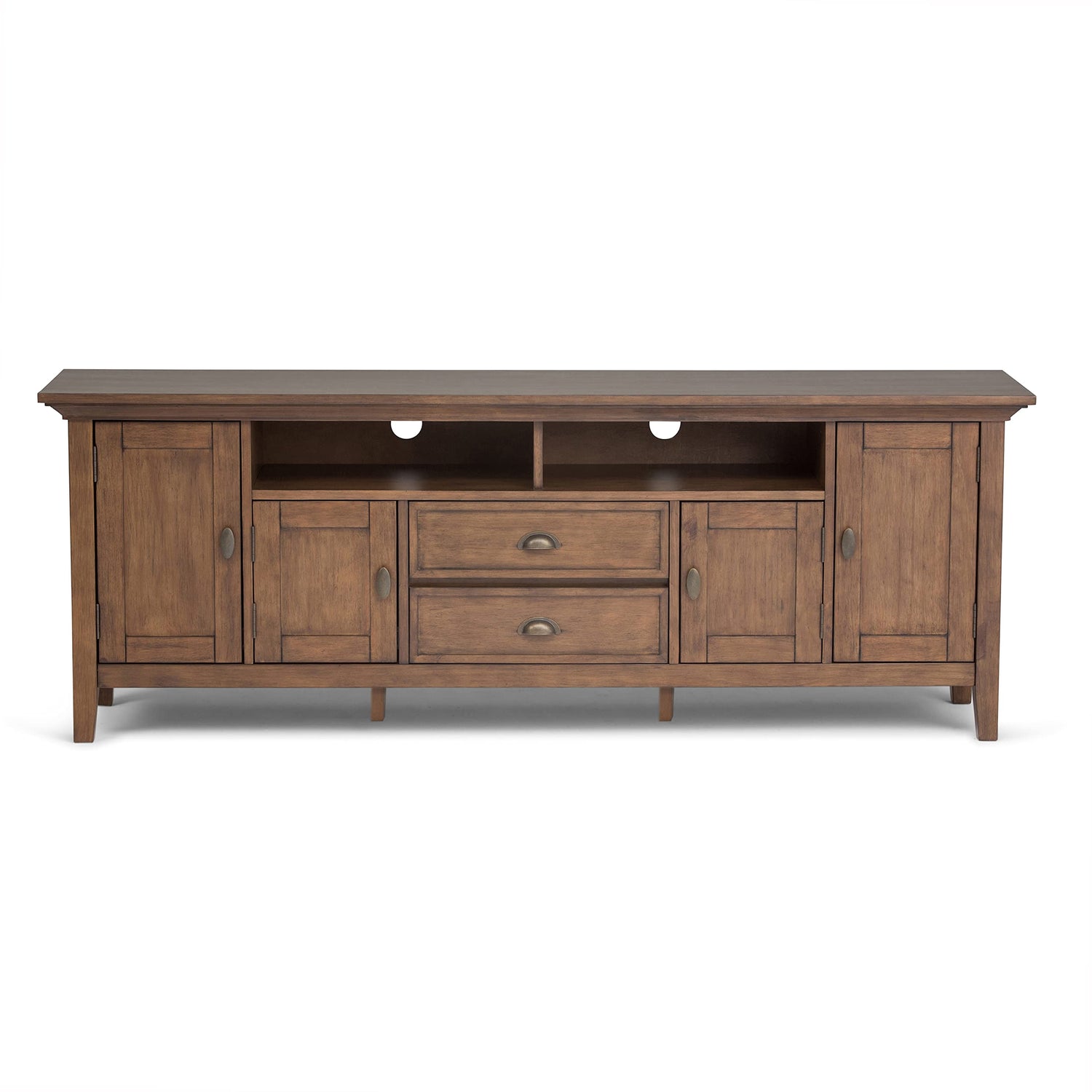 Details: Now that 80 inch flat screen TVs are more affordable, you need to have one. To enjoy it fully, you will also need the perfect TV Stand to position your TV just right. Look no further. The Redmond Extra Wide TV Stand is perfectly sized for TVs up to 80 inches. It has plenty of storage space for all your media and gaming devices. It has a large centrally located open area with two drawers as well as two enclosed spaces. The two large side storage cabinets open to one adjustable shelf each. The unit features cord management cut-outs for easy installation of TV and media components. The unit includes cord management cut-outs for easy installation of TV and media components. Style includes elegantly tapered legs, molded crown edged table top and Antique Brass pulls and knobs. Efforts are made to reproduce accurate colors, variations in color may occur due to computer monitor and photography. At Simpli Home we believe in creating excellent, high quality products made from the finest materials at an affordable price. Every one of our products come with a 1-year warranty and easy returns if you are not satisfied.