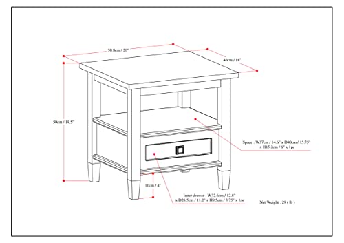 Details: Good things really do come in small packages. Nothing could illustrate this better than the design of our Warm Shaker End Table which features one drawer and one open shelf providing plenty of storage space. The table is sized perfectly to allow room for a table lamp, book and family photos. A perfect companion to any sofa or arm chair. Available in a warm Honey Brown, Black, Farmhouse Grey, rich Tobacco Brown finish, and Distressed Grey finishStyle includes rounded rectangular Brushed Nickel knob, square tapered legs and square edged table top. Assembly required. Efforts are made to reproduce accurate colors, variations in color may occur due to computer monitor and photography. At Simpli Home we believe in creating excellent, high quality products made from the finest materials at an affordable price. Every one of our products come with a 1-year warranty and easy returns if you are not satisfied.
