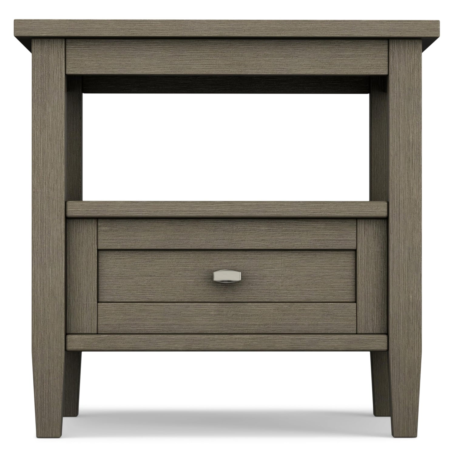 Details: Good things really do come in small packages. Nothing could illustrate this better than the design of our Warm Shaker End Table which features one drawer and one open shelf providing plenty of storage space. The table is sized perfectly to allow room for a table lamp, book and family photos. A perfect companion to any sofa or arm chair. Available in a warm Honey Brown, Black, Farmhouse Grey, rich Tobacco Brown finish, and Distressed Grey finishStyle includes rounded rectangular Brushed Nickel knob, square tapered legs and square edged table top. Assembly required. Efforts are made to reproduce accurate colors, variations in color may occur due to computer monitor and photography. At Simpli Home we believe in creating excellent, high quality products made from the finest materials at an affordable price. Every one of our products come with a 1-year warranty and easy returns if you are not satisfied.