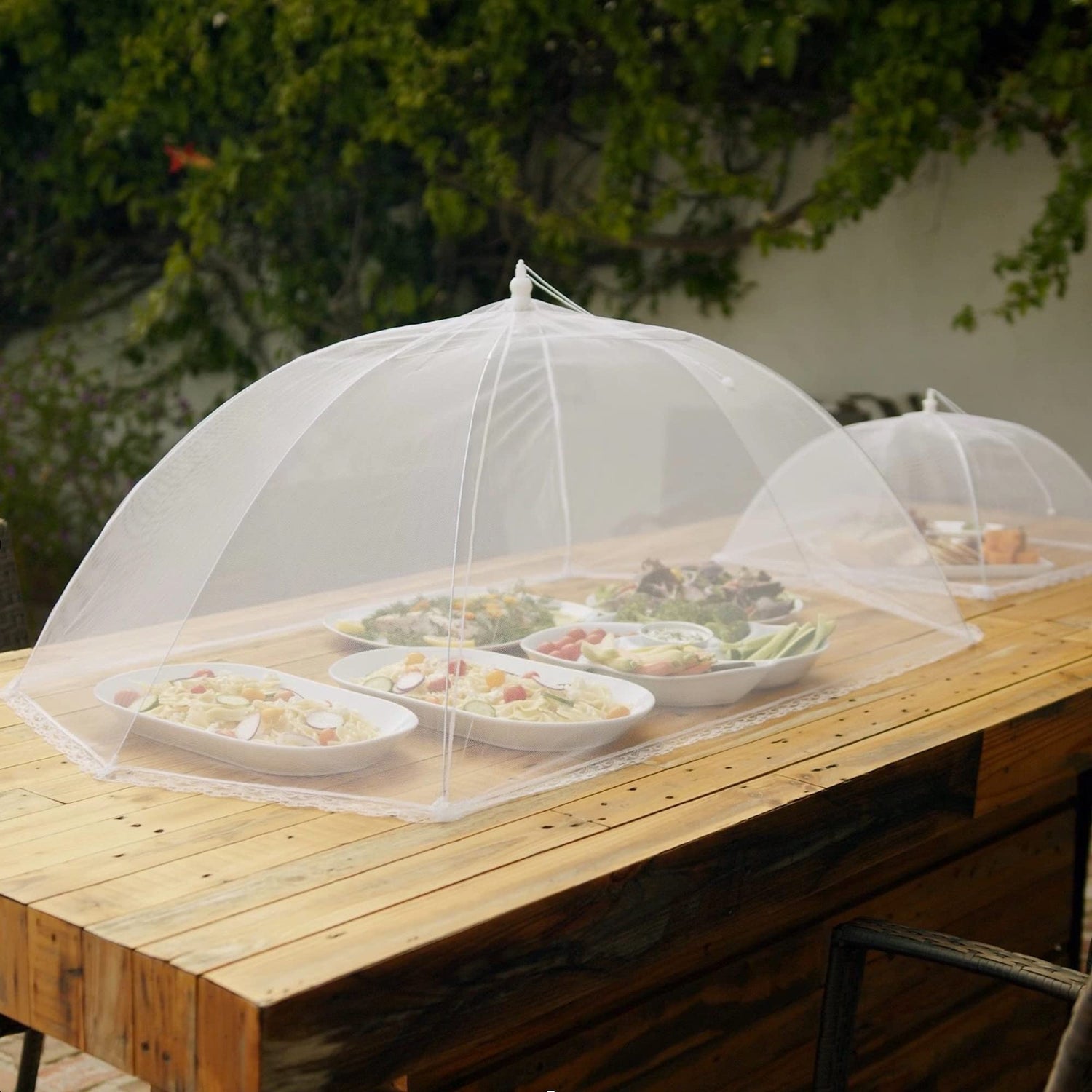 • Zero Waste, Elegant Look: Food screens for outside reduce stress and improve al-fresco dining. Bottom of collapsible food covers are finished with moderate lace edging acting as a barrier, an effective net for food. Better for the planet, re-usable outside food covers protect platters of food better than tinfoil, paper towels or paper plates with zero waste. Include the food pop up tent in all your party supplies.