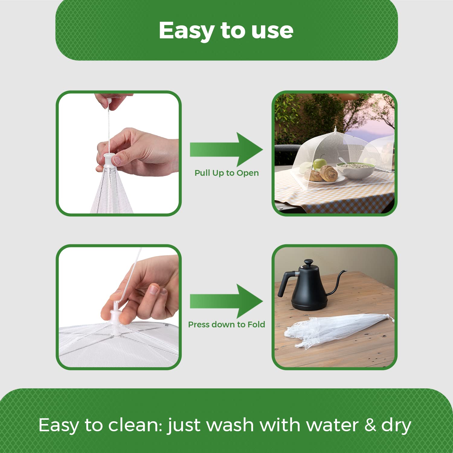 • Covers Up to 16" Serving Dishes: Set of 6 white Simply Genius food covers protects food from the elements. Collapsible mesh food covers for outside allows heat to escape and keeps food visible. Outdoor tent food cover is ideal for large crowds or moving buffet lines. Food covers for outside are easy to lift one handed, serve food with the other. Generously sized food nets for picnics fits full size dinner plate and serving dishes up to 16” inches in diameter and 10" inches high.