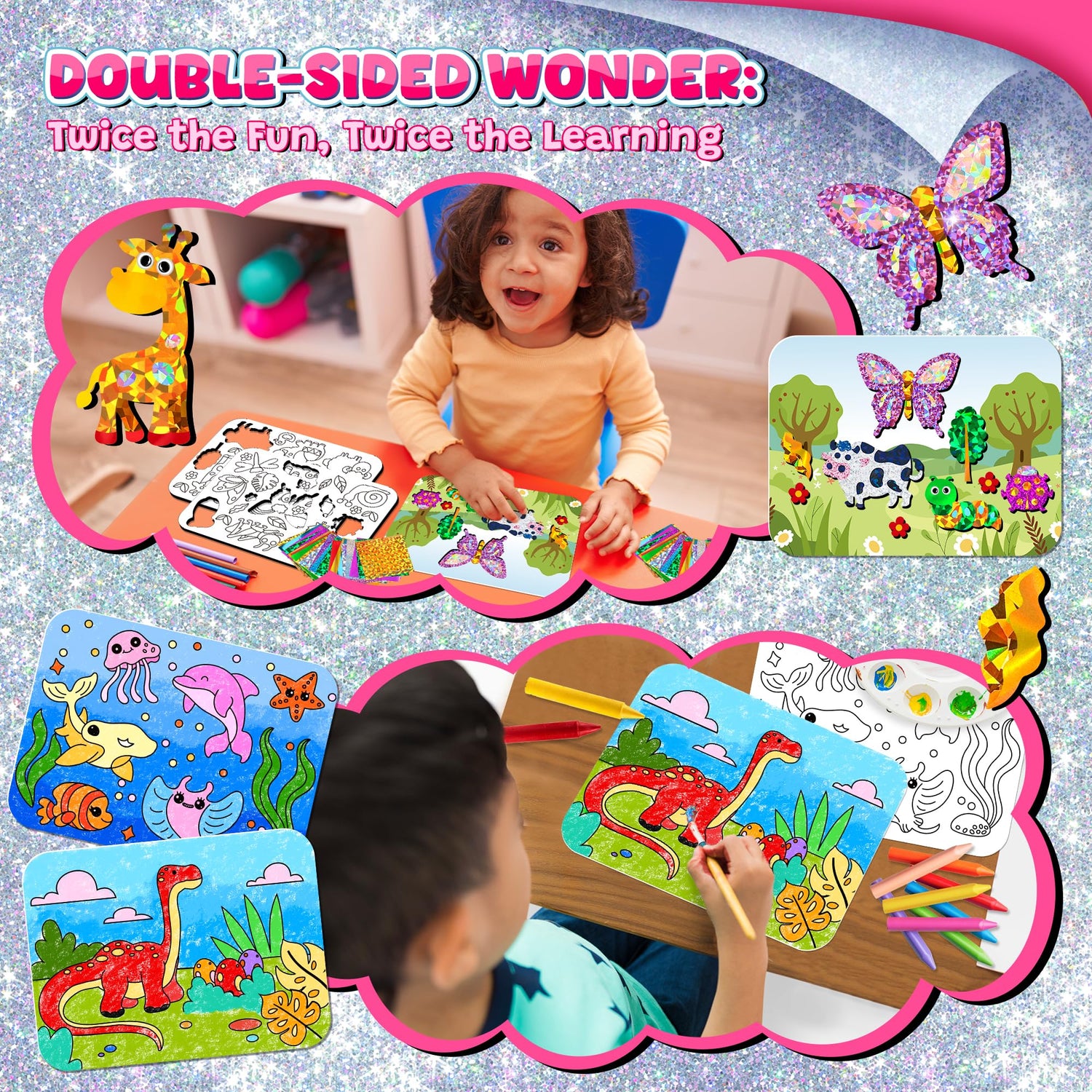 - 【Foam Stickers & Coloring Cards】Double-Fun.This foil art for kids is simple to use, with foil stickers and foam stickers that are easy to peel and stick, making it perfect even for little ones. Kids can freely choose their favorite patterns and colors, applying the foil sheets to the canvases to create one-of-a-kind masterpieces. Coloring cards make the kids world become more colorful. The user-friendly design ensures every child can become a little artist and experience the joy of creation!