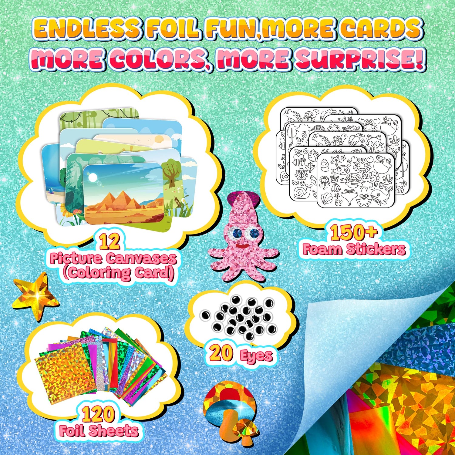 - 【Ignite Creative Sparks】When children open this foil art sticker kit, their eyes will light up with excitement! With 12 exquisite canvases, over 120 dazzling foil sheets, and more than 150 foam stickers, this foil fun art kit for kids 4-8 is the perfect way to inspire young artists.