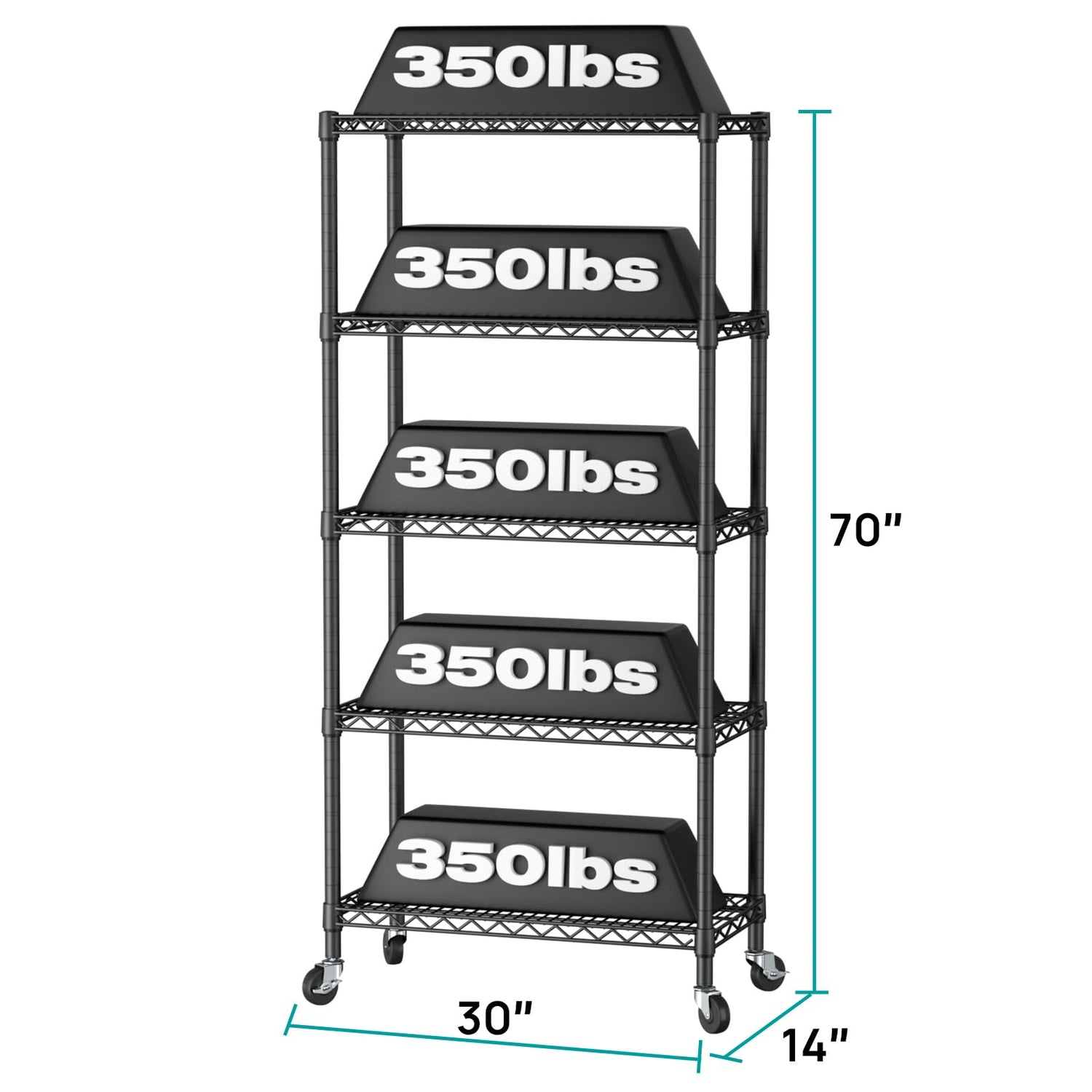 - Weight Capacity:Each shelf holds up to 350 pounds (evenly distributed); total max load weight is 1750 pounds;the maximum weight with wheels is 530 pounds