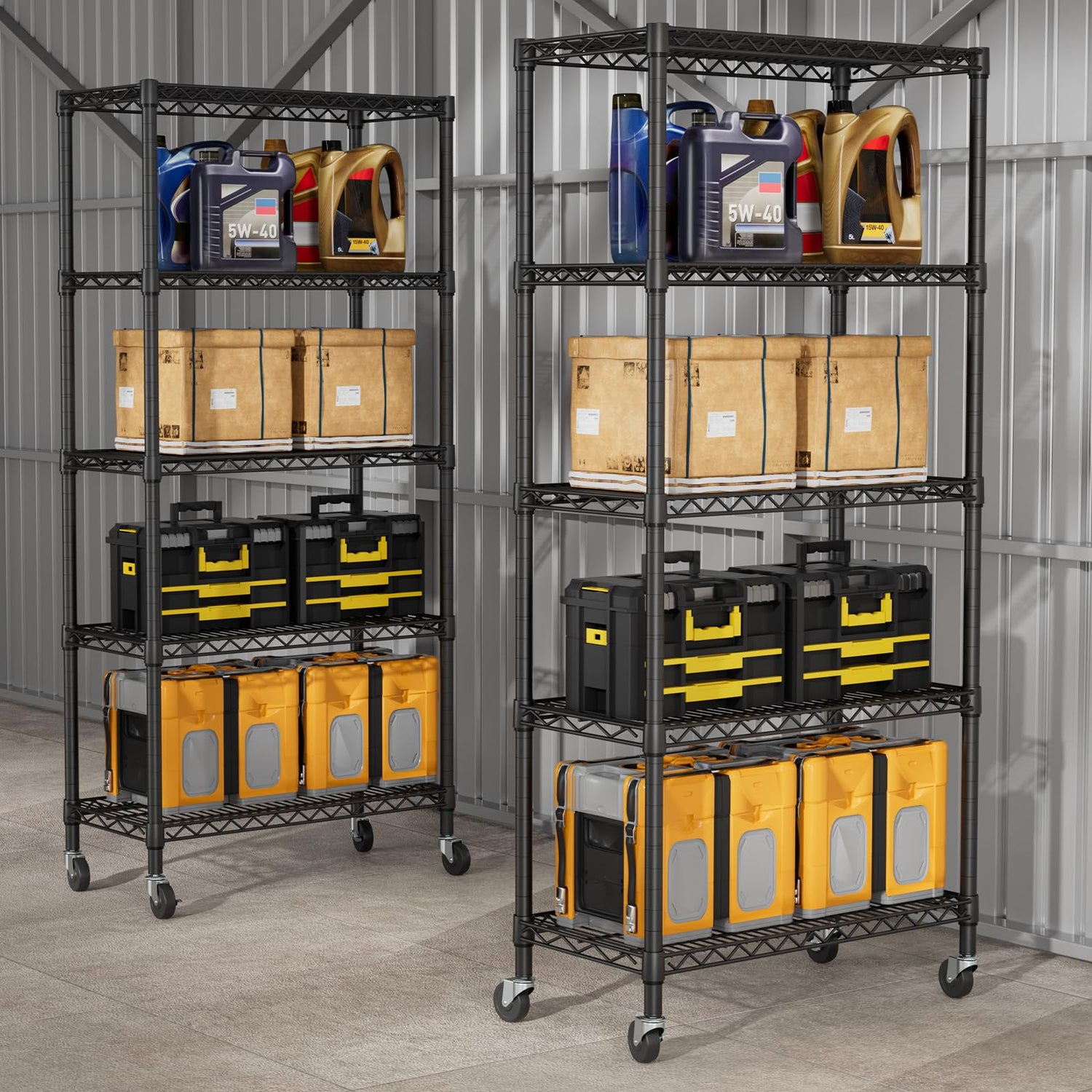 SINGAYE 5 Shelf Adjustable Heavy Duty Storage Shelving Unit with Wheels Steel Organizer Wire Rack Shelves Bathroom Organizers and Shelf Wire Closet Metal Pantry Kitchen Garage 14" DX30 WX70 H Black