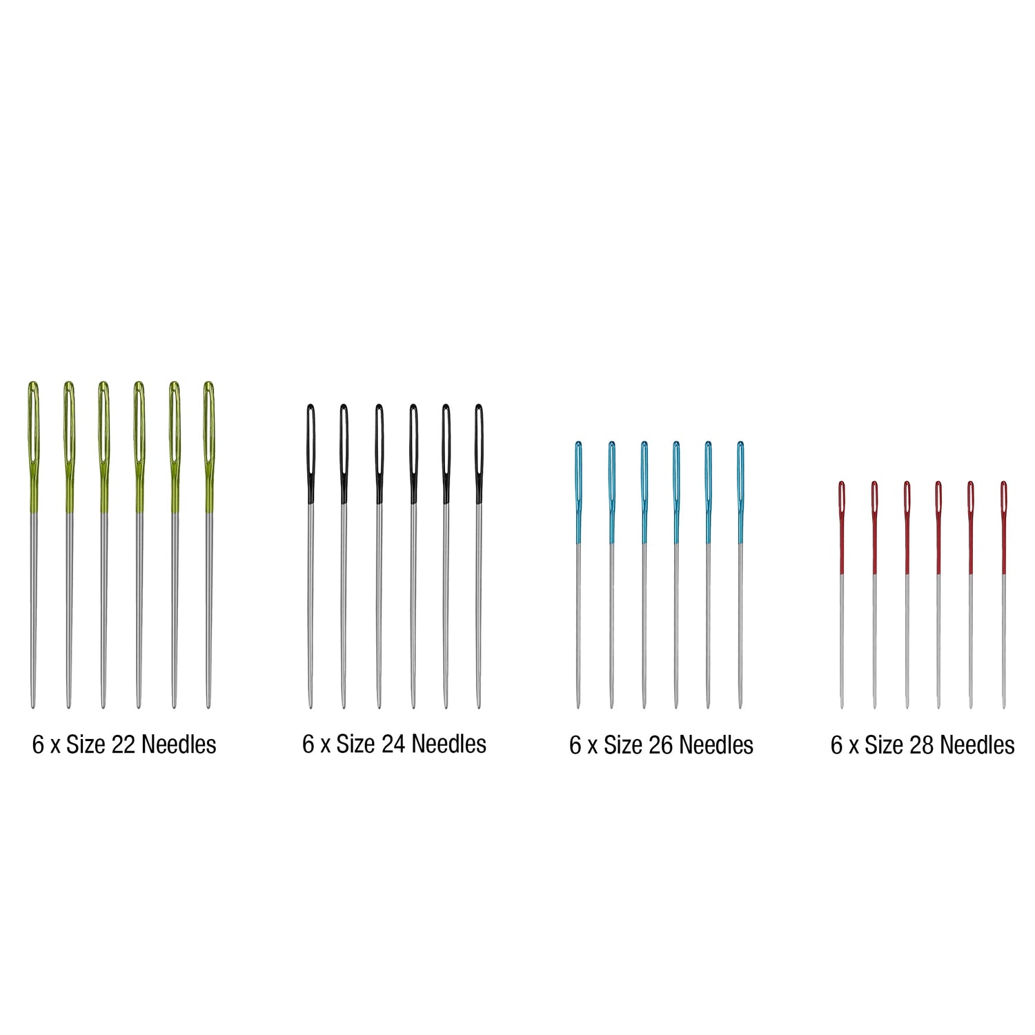 - Includes 24 assorted tapestry needles color coded by size: six green size 22 needles, six black size 24 needles, six blue size 26 needles and six red size 28 needles in a dial compact
