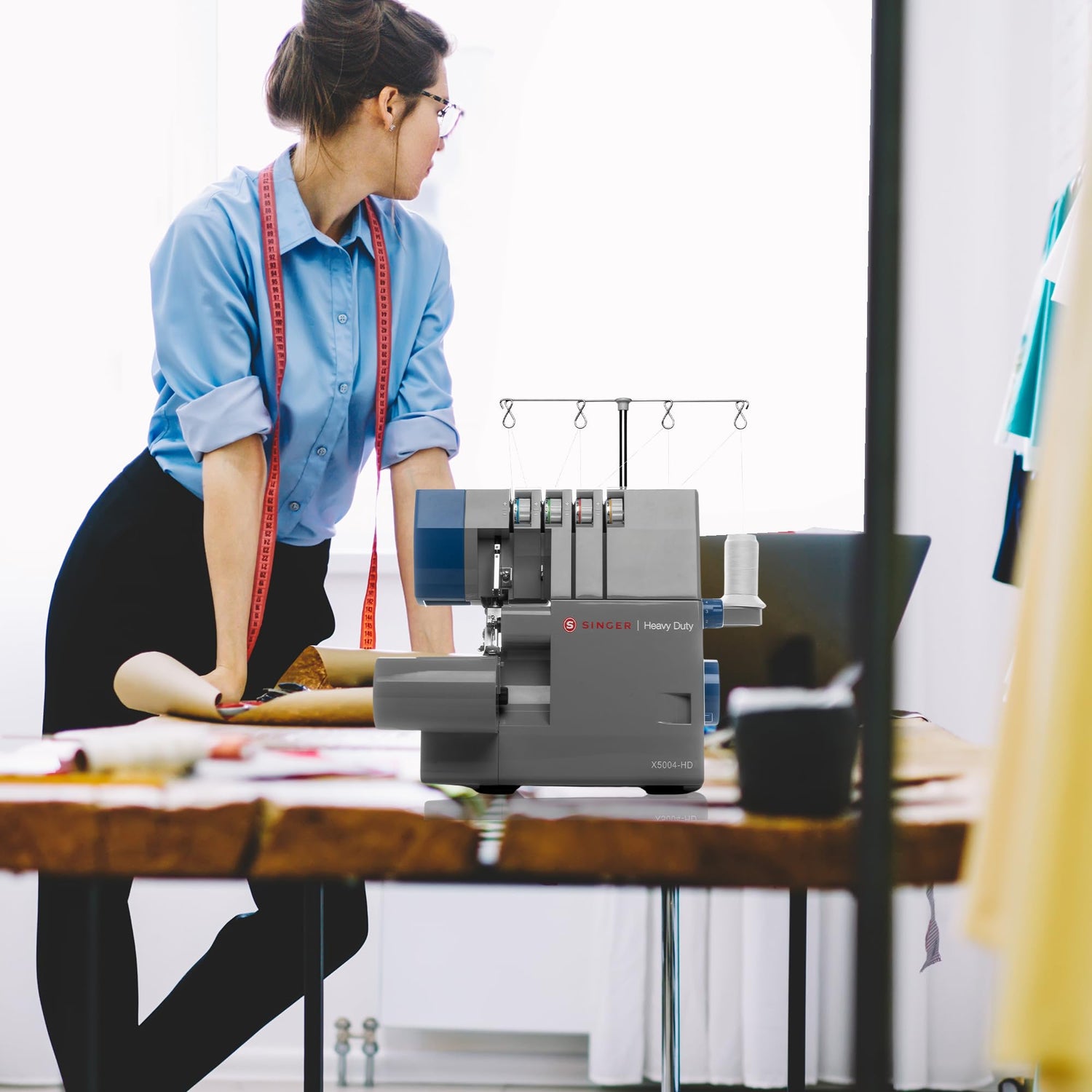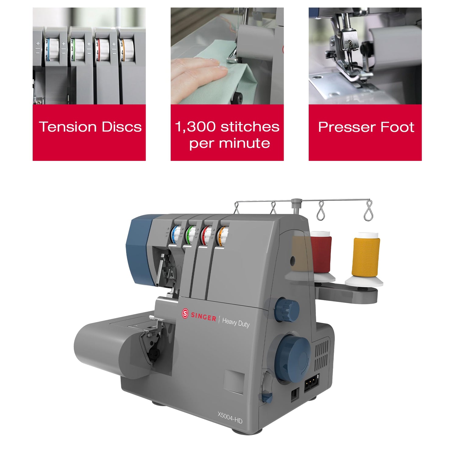 Details: The SINGER®X5004HD serger saves time by sewing a seam and seam finish at the same time, while trimming away the excess seam allowance. Features 2 threads, 3 threads, or 4 threads for a variety of stitch combinations. With a 60% larger cutting knife than other SINGER® sergers, the X5004HD cuts thicker fabrics with ease.