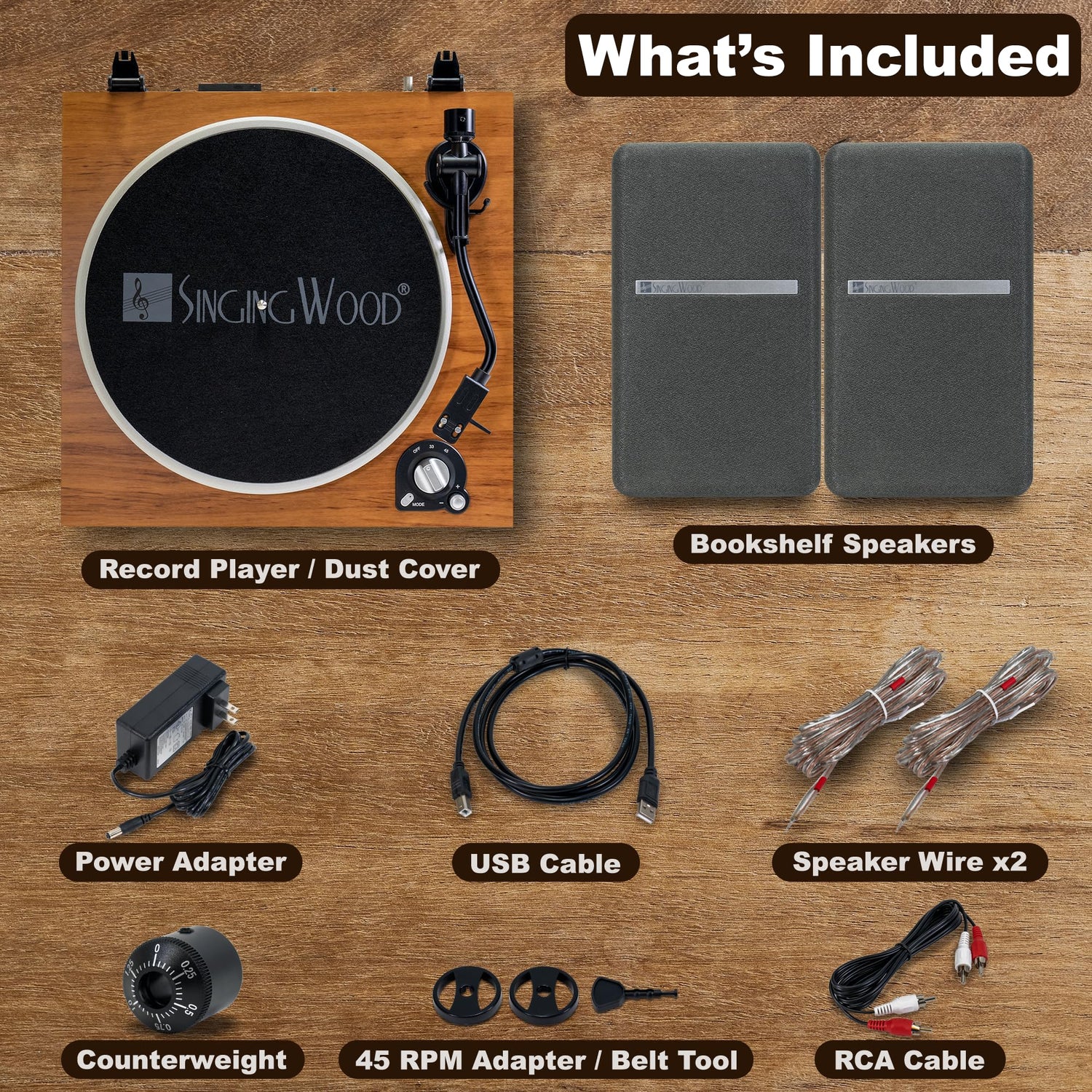 SingingWood Audio VP42AS Bluetooth Belt Drive 2 Speed Built in Preamp Turntable Hi-Fi with 44 Watt Bookshelf Speakers, Vinyl Record Player with Magnetic Cartridge Bluetooth Playback (Walnut)