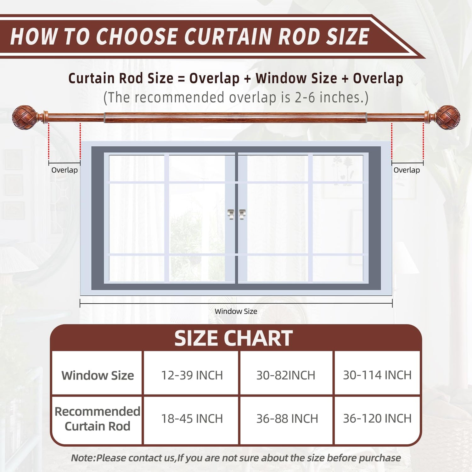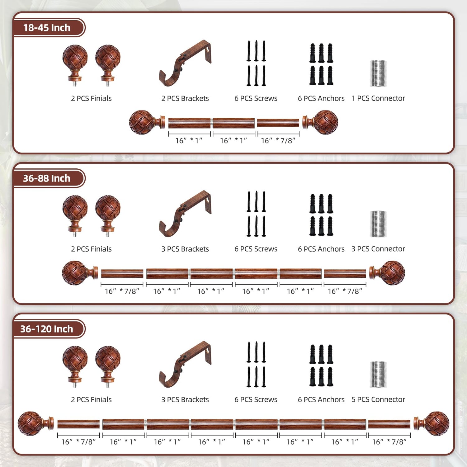 - Curtain Rods for Windows 28 to 48 inch(2.3-4ft): Curtain rods include 2 x 16" x 1"fixed rods, 1 x 16" x 7/8"adjustable rods, 2 x finial, 2 x bracket, 1 x connector, 4 x anchor, 4 x screw. Curtain rods for windows can extend from 18 to 45 inches, choose the right size curtain rods according to the length of your window.