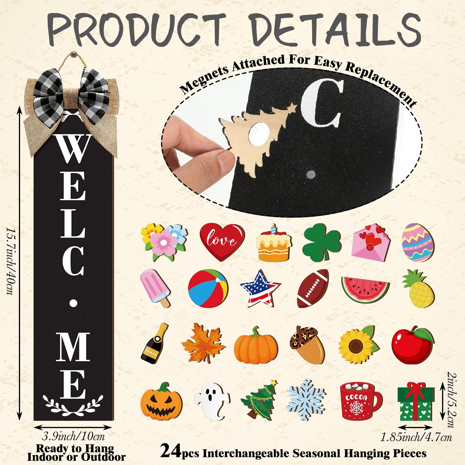Sintuff Welcome Sign for Front Door Interchangeable Porch Sign with 24 Pcs Holiday Icons Home Farmhouse Welcome Outdoor Seasonal Rustic Sign for Spring Easter St Patrick's Day(Black)